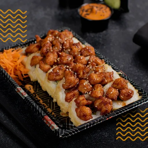 Pepino, aguacate, philadelphia, tocino y res por dentro. Empanizado. Topping de pollo crispy en salsa sweet y ajonjolí.