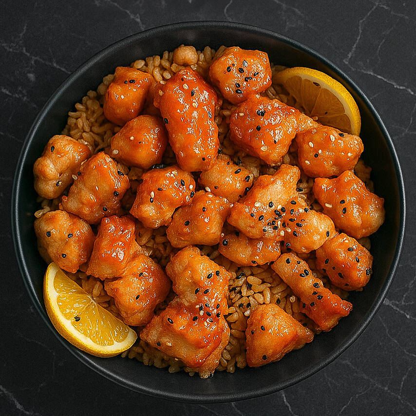 Sabroso pollo capeado en salsa de naranja, servido sobre arroz con ajonjolí blanco y negro. una combinación de dulzura cítrica y crujiente textura.