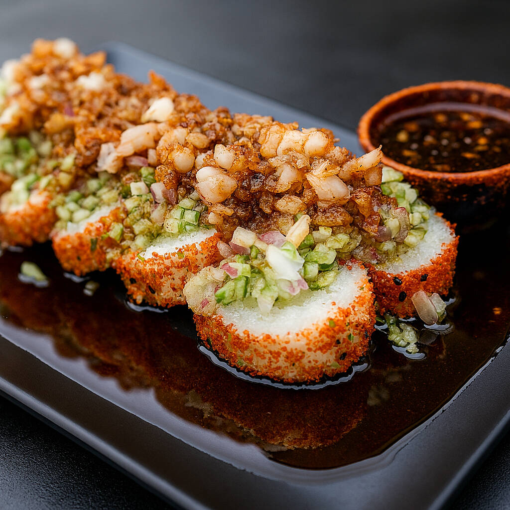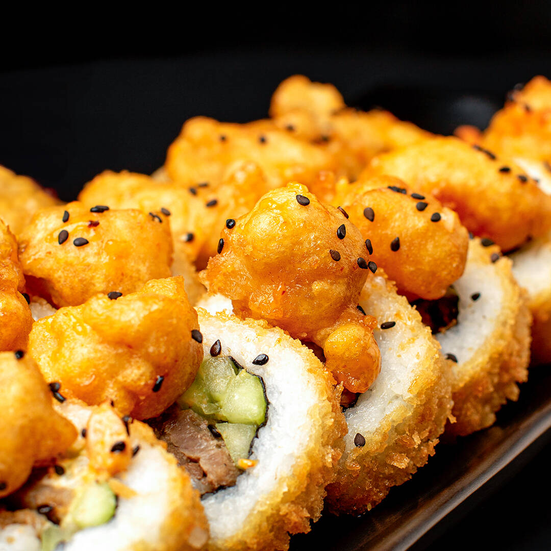 Una explosión de sabores con pepino, aguacate, queso philadelphia, alga, res y topping de camarón roca bañados en una salsa picante y adornados con ajonjolí negro. empanizado, cada bocado es una experiencia de rock y sabor.