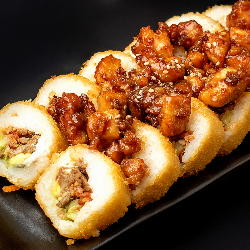 Rollo empanizado con pepino, aguacate, queso philadelphia, tocino, res, y topping de pollo crispy bañado en salsa dulce, cubierto con ajonjolí blanco, una experiencia inolvidable.