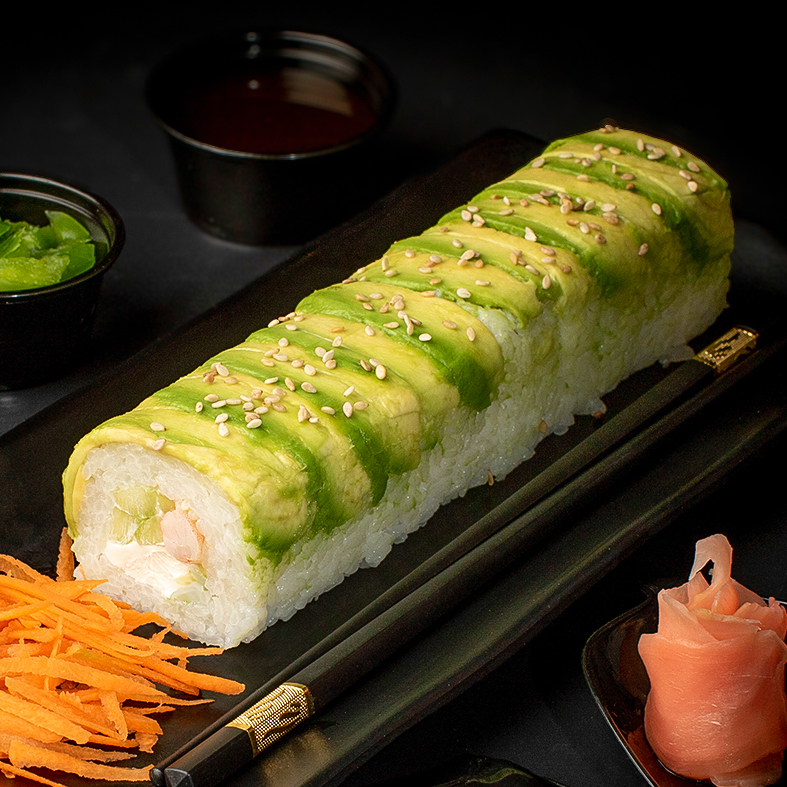 Pepino, aguacate, queso philadelphia, camarón y forrado de aguacate, adornado con ajonjolí blanco. frescura y cremosidad en cada bocado.