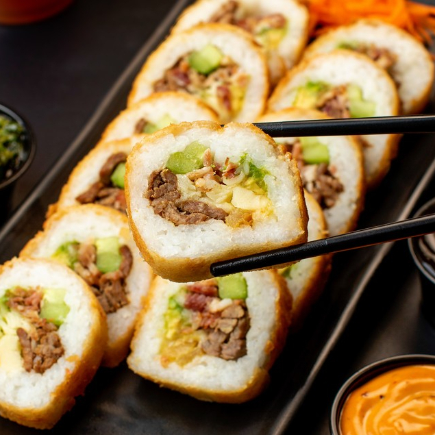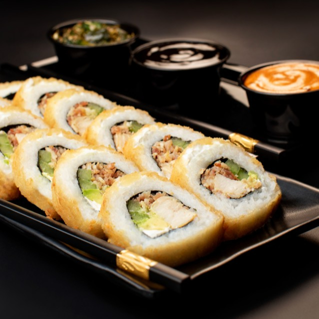 Pepino, aguacate, queso philadelphia, alga, tocino, res y queso monterrey, todo empanizado. con proteína a elección entre camarón, res o pollo ¡una obra maestra de sabores y texturas en cada rollo!.