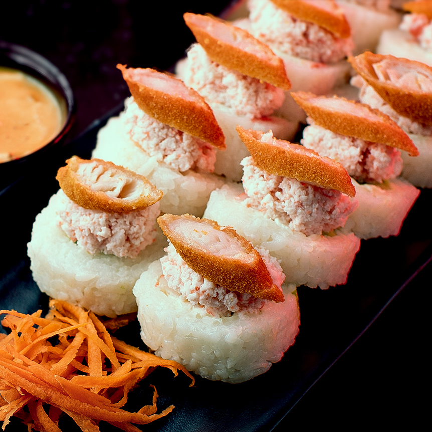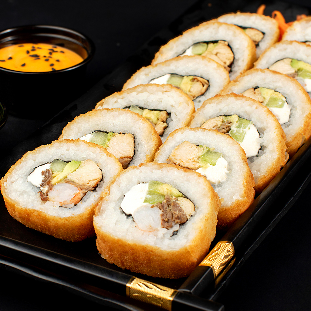 Una experiencia completa con pepino, aguacate, queso philadelphia, alga, camarón, pollo y res, empanizado para una textura crujiente. todo en un rollo.