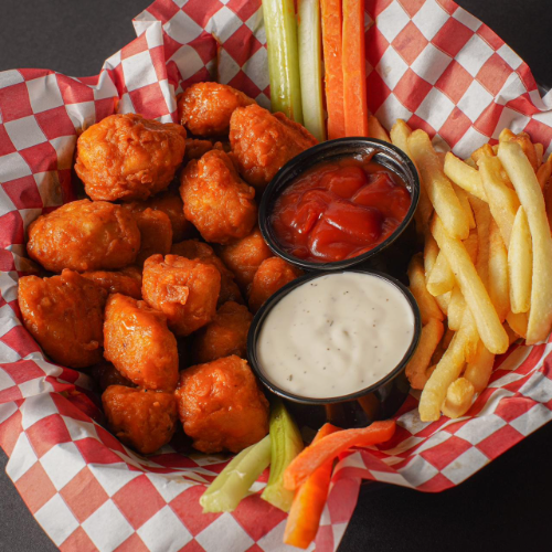 Jugosos boneless con papas fritas y crujientes tiras de zanahoria y apio, acompañados de salsa buffalo o bbq para una experiencia de sabor inigualable.
