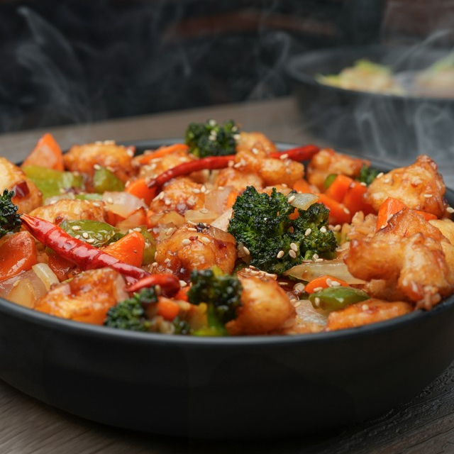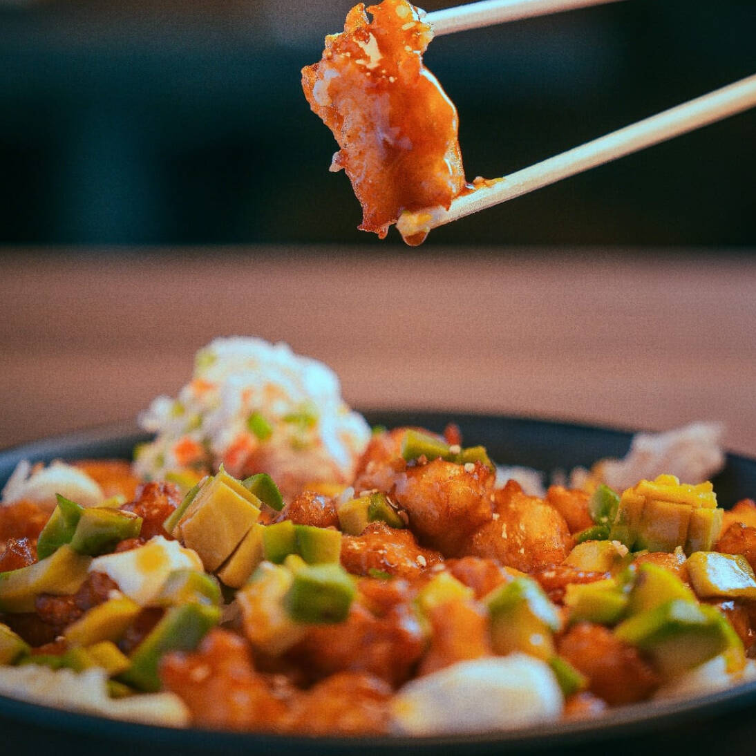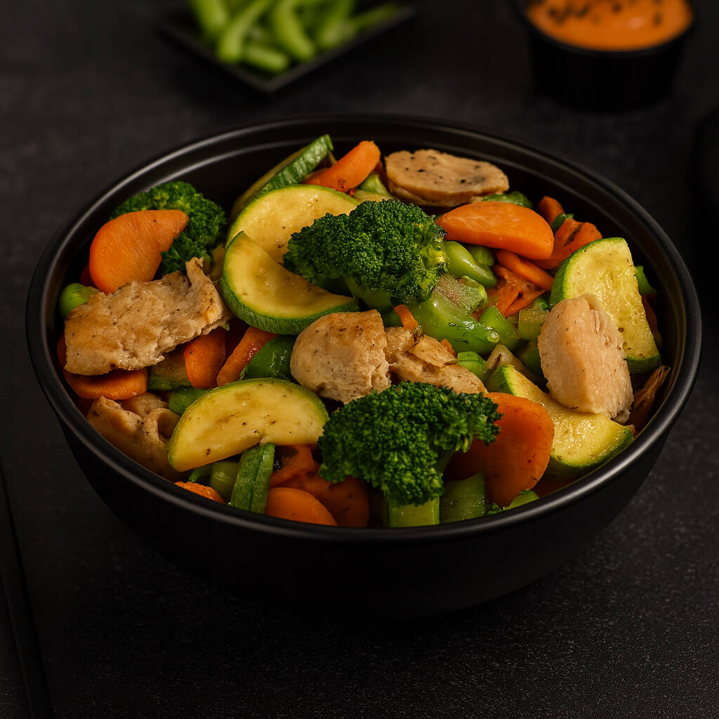 Generoso tazón de arroz de tu elección con pollo capeado, salsa thai, una variedad de verduras frescas: chile morrón, zanahoria, cebolla, brócoli,chile de árbol y ajonjolí blanco. una fusión exótica de sabores asiáticos.