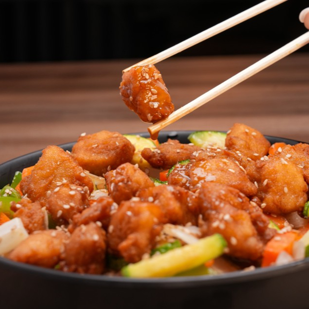 Pollo empanizado en salsa dulce, servido con arroz de tu elección y verduras frescas: zanahoria, calabaza, cebolla y chile morrón, decorado con ajonjolí blanco. ¡satisfacción crujiente garantizada!.