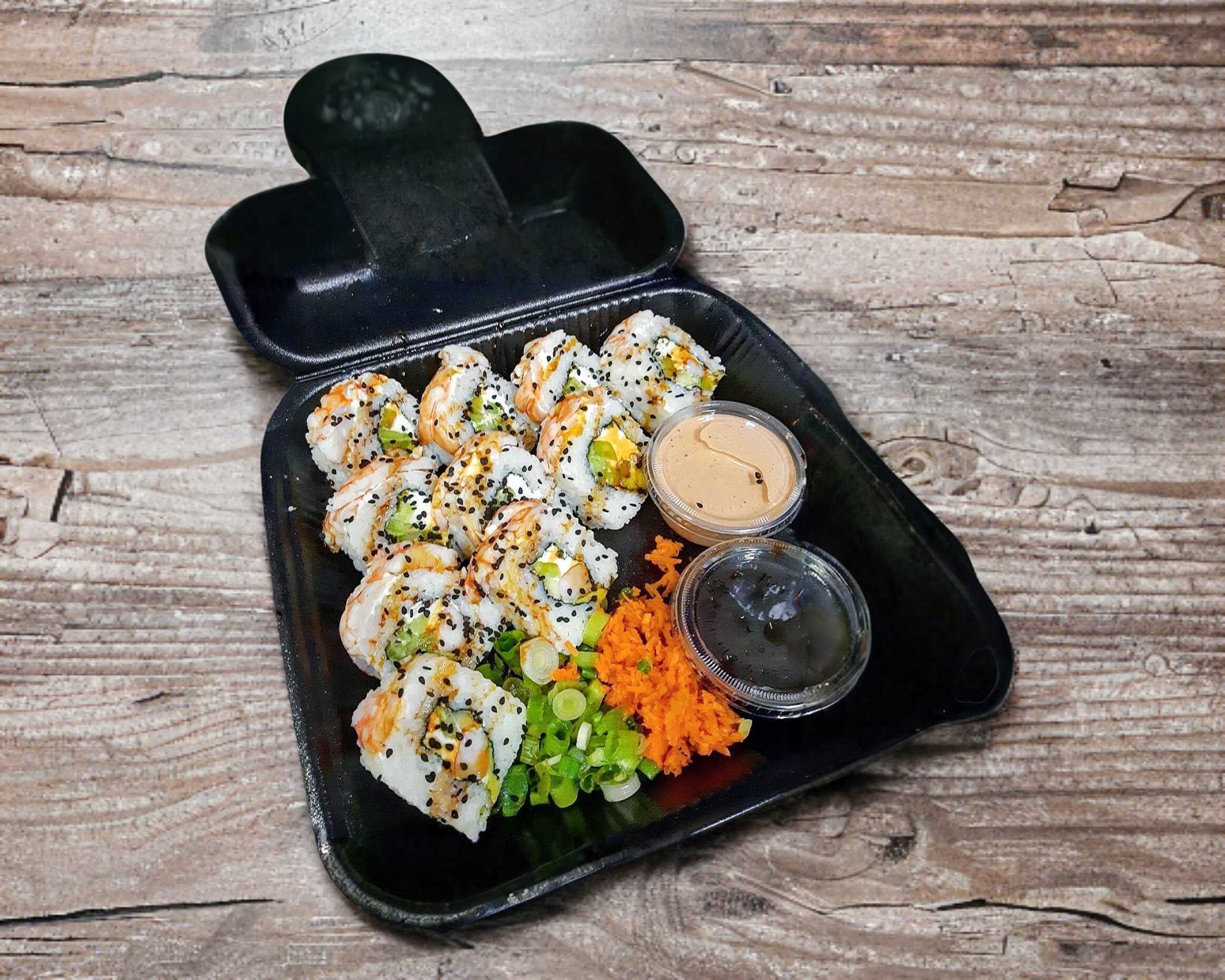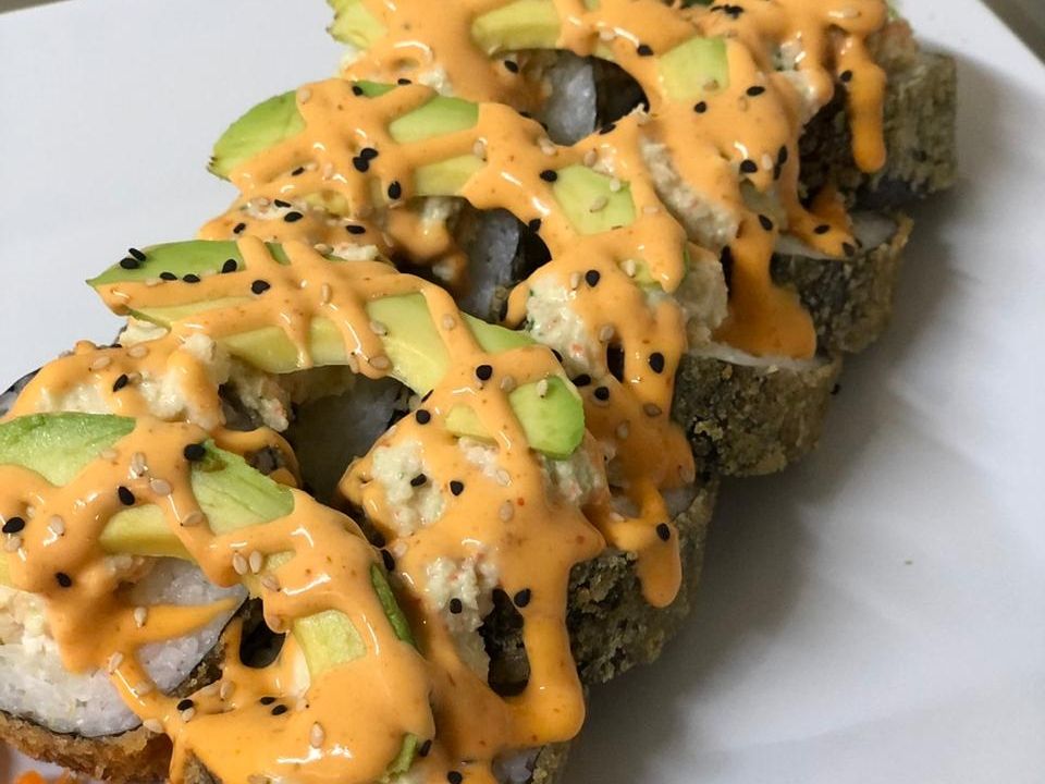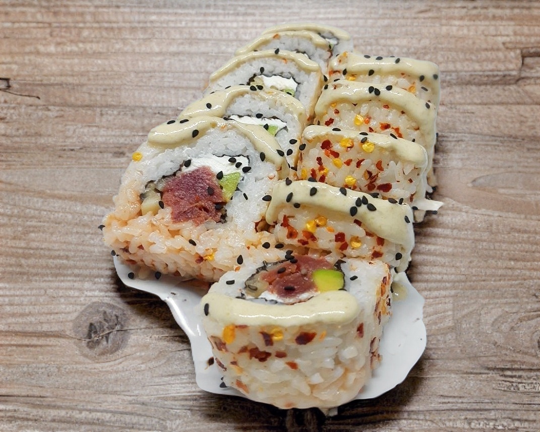 Empanizado, res,pollo , aguacate, Philadelphia pepino, con topping Tampico rebanadas aguacate, bañado aderezo Spicy