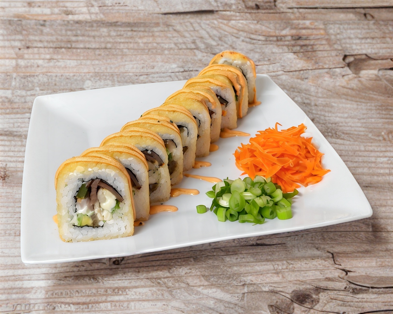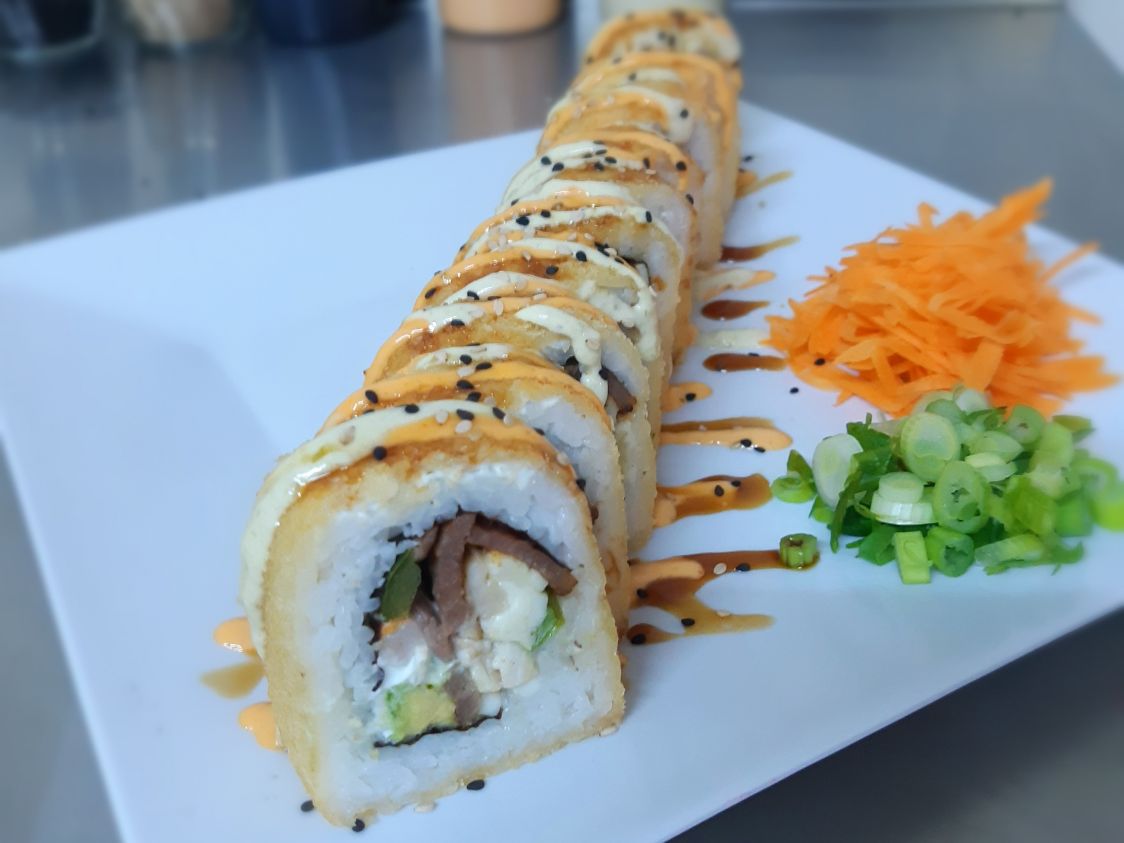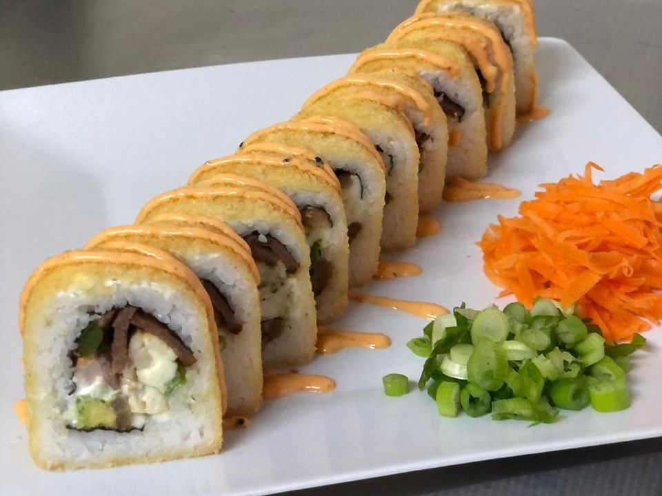 Empanizado, res, pollo, camarón, aguacate, Philadelphia, tocino, queso mozzarela, chiles toreados, forrado en philadelphia, bañado en aderezo spicy, aderezo jalapeño y salsa de anguila