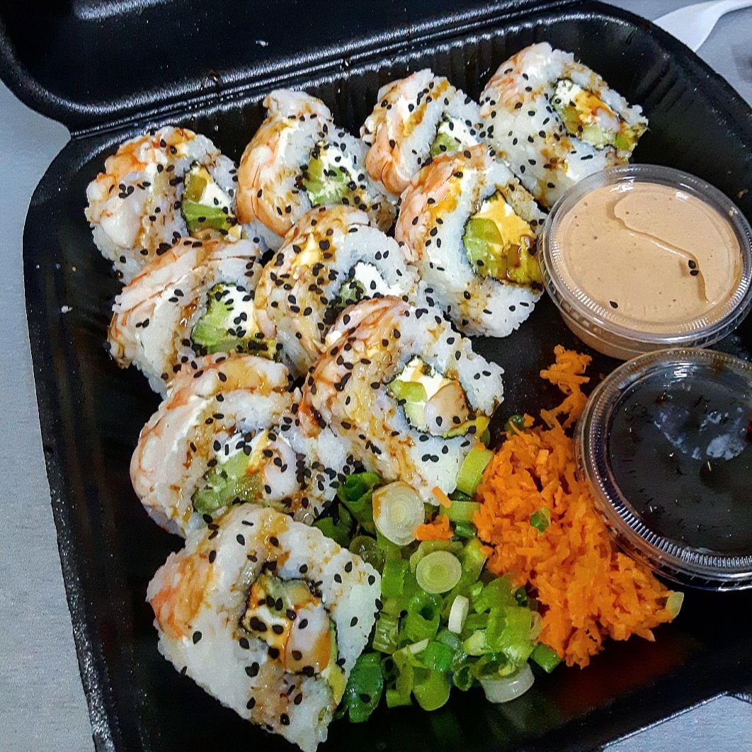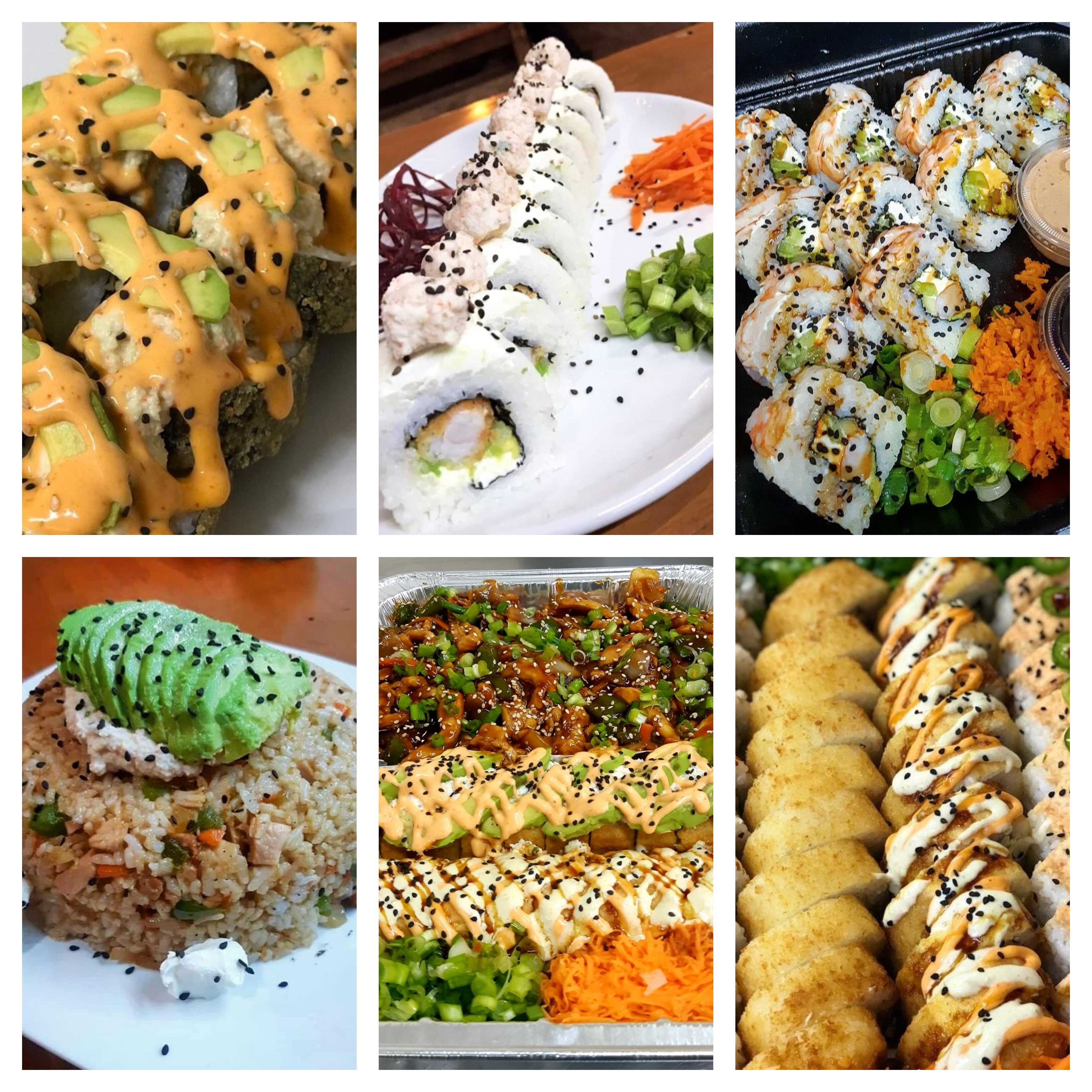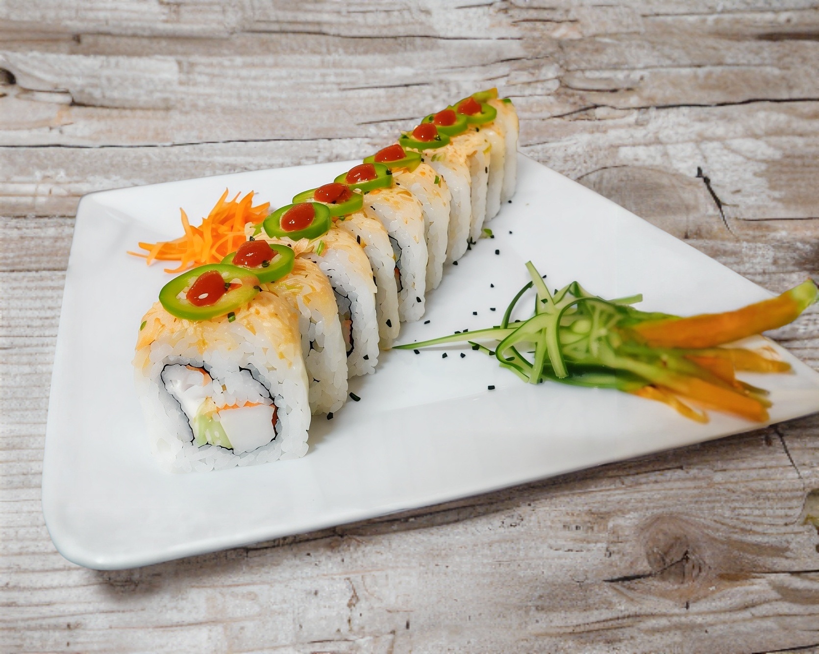 Empanizado, res, pollo, camarón, aguacate, Philadelphia, tocino, queso mozzarela, chiles toreados, forrado en philadelphia, bañado en aderezo spicy, aderezo jalapeño y salsa de anguila
