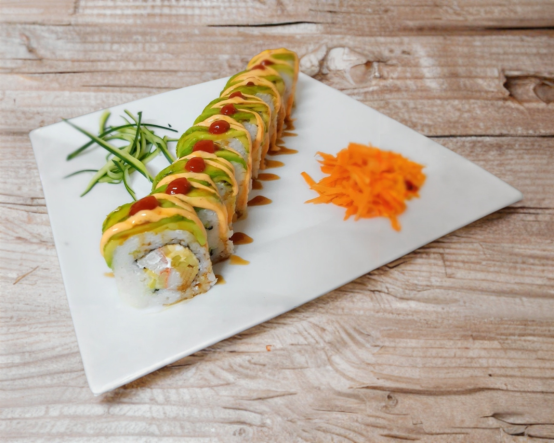 Relleno de fresco medallon de Atún picante, aguacate, queso philadelphia, pepino y forrado de aguacate bañado en salsa anguila y aderezo jalapeño