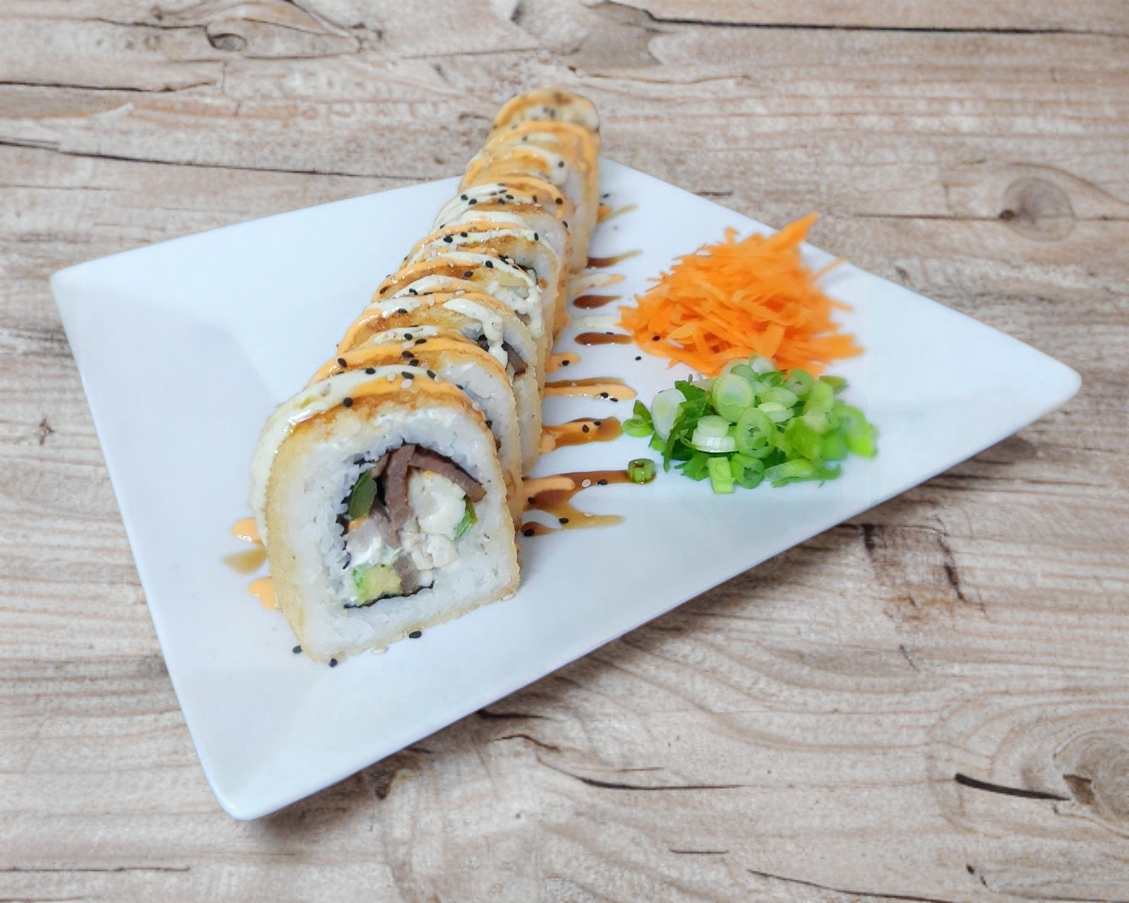 Bañado en aderezo jalapeño, empanizado, carne asada, tocino, aguacate, cebollin,chiles toreados, queso philadelphia, queso manchego