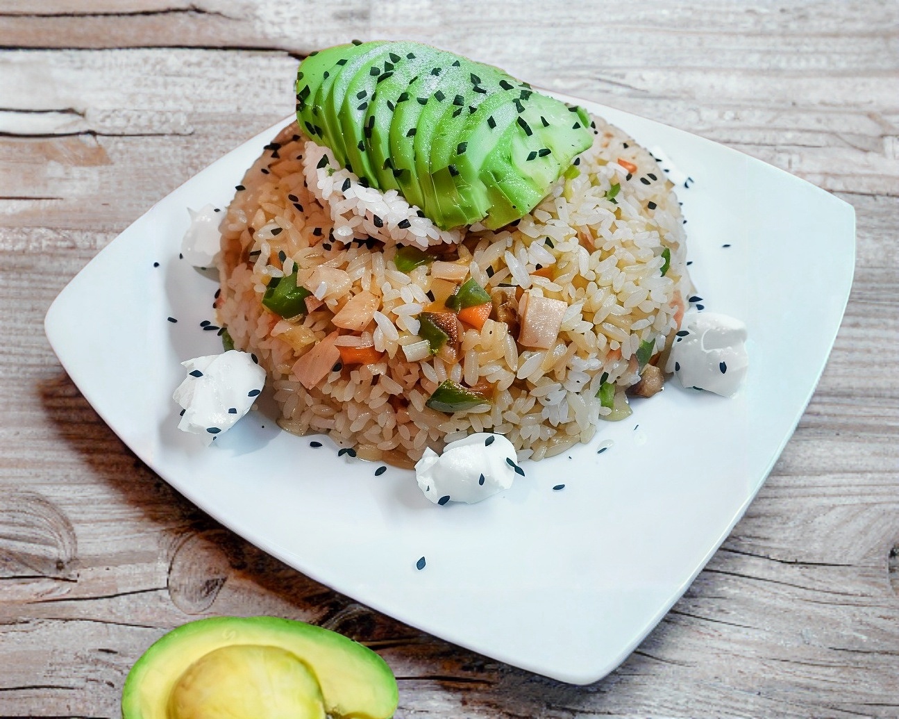 Arroz frito con trozitos de verdura res, pechuga de pollo y camarón, con topping de tampico, aguacate y cremoso queso philadelphia