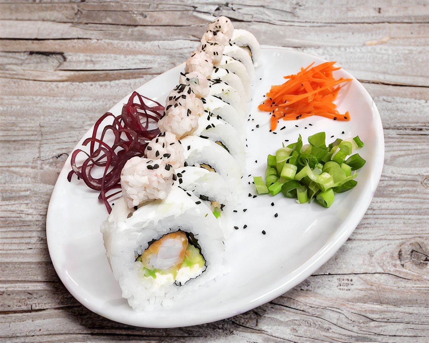 Camarones, pechuga o surimi, pepino, aguacate y queso philadelphia