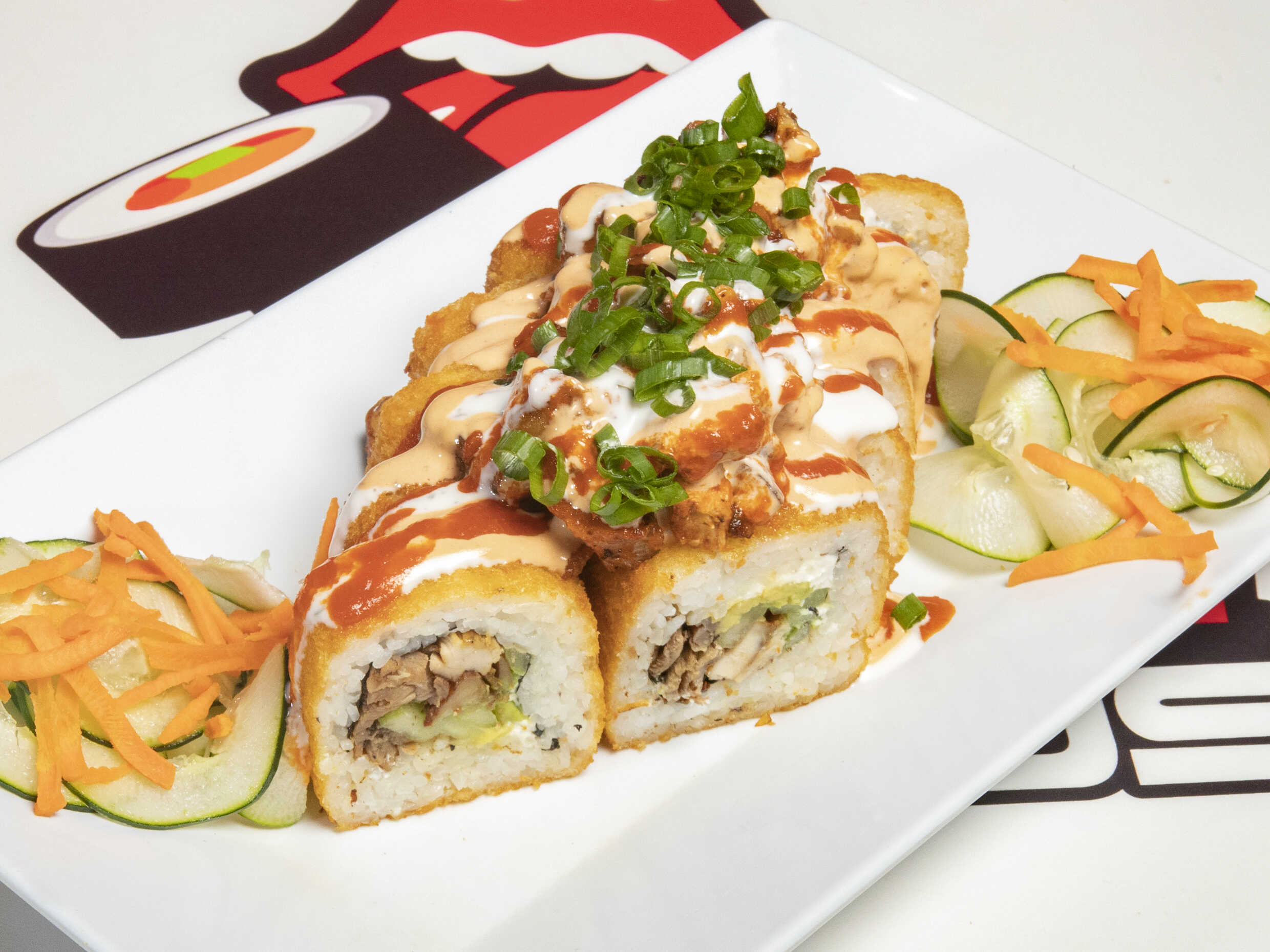 3 Rollos a elegir (2 empanizados y 1 natural) porción de Teriyaki de pollo, aderezo chipotle y chiles toreados.