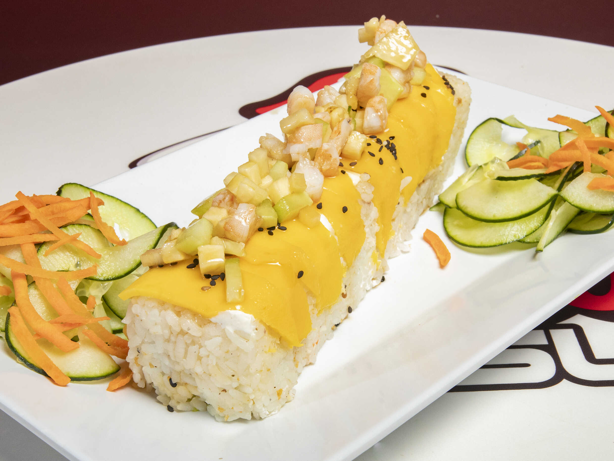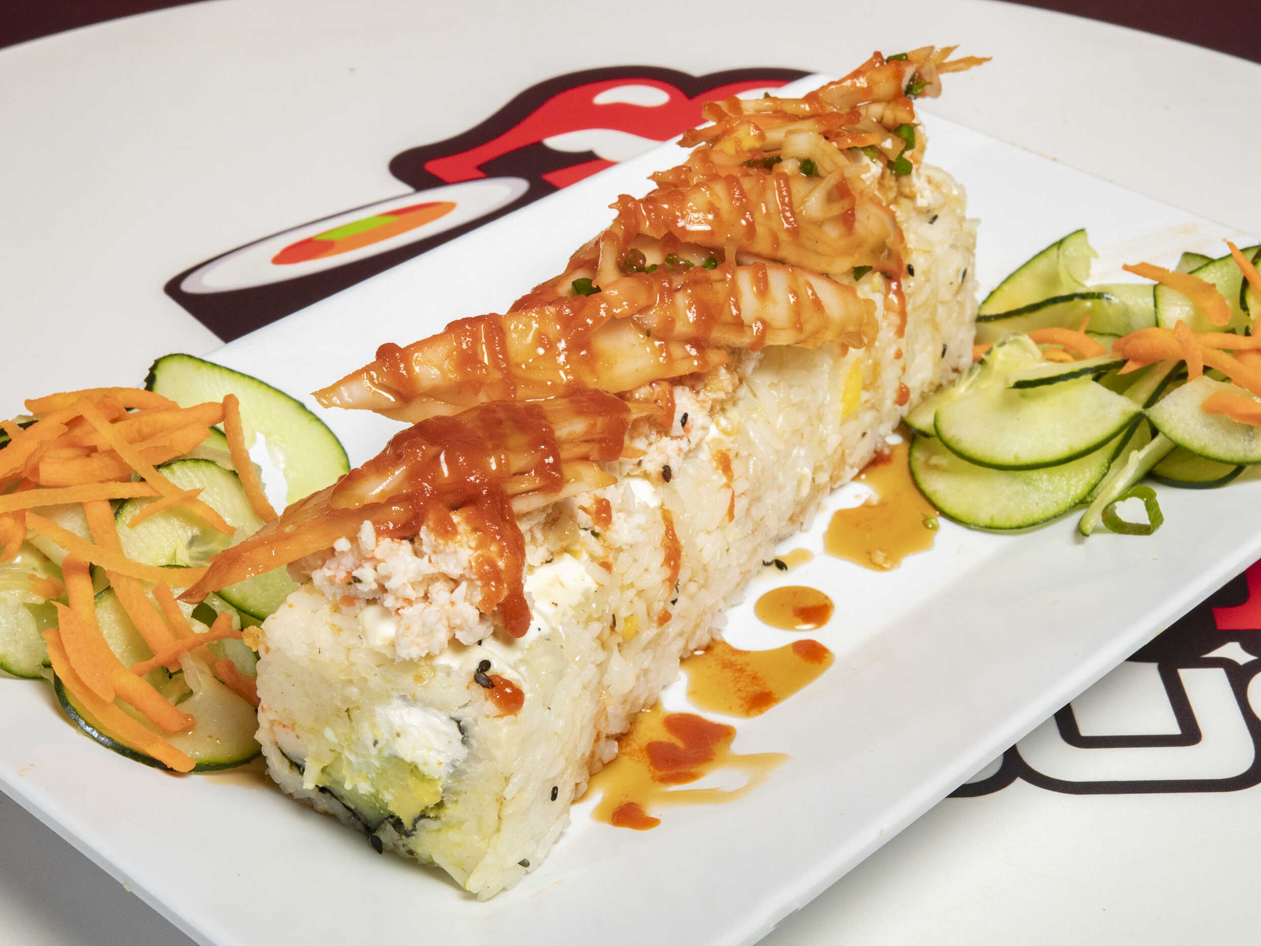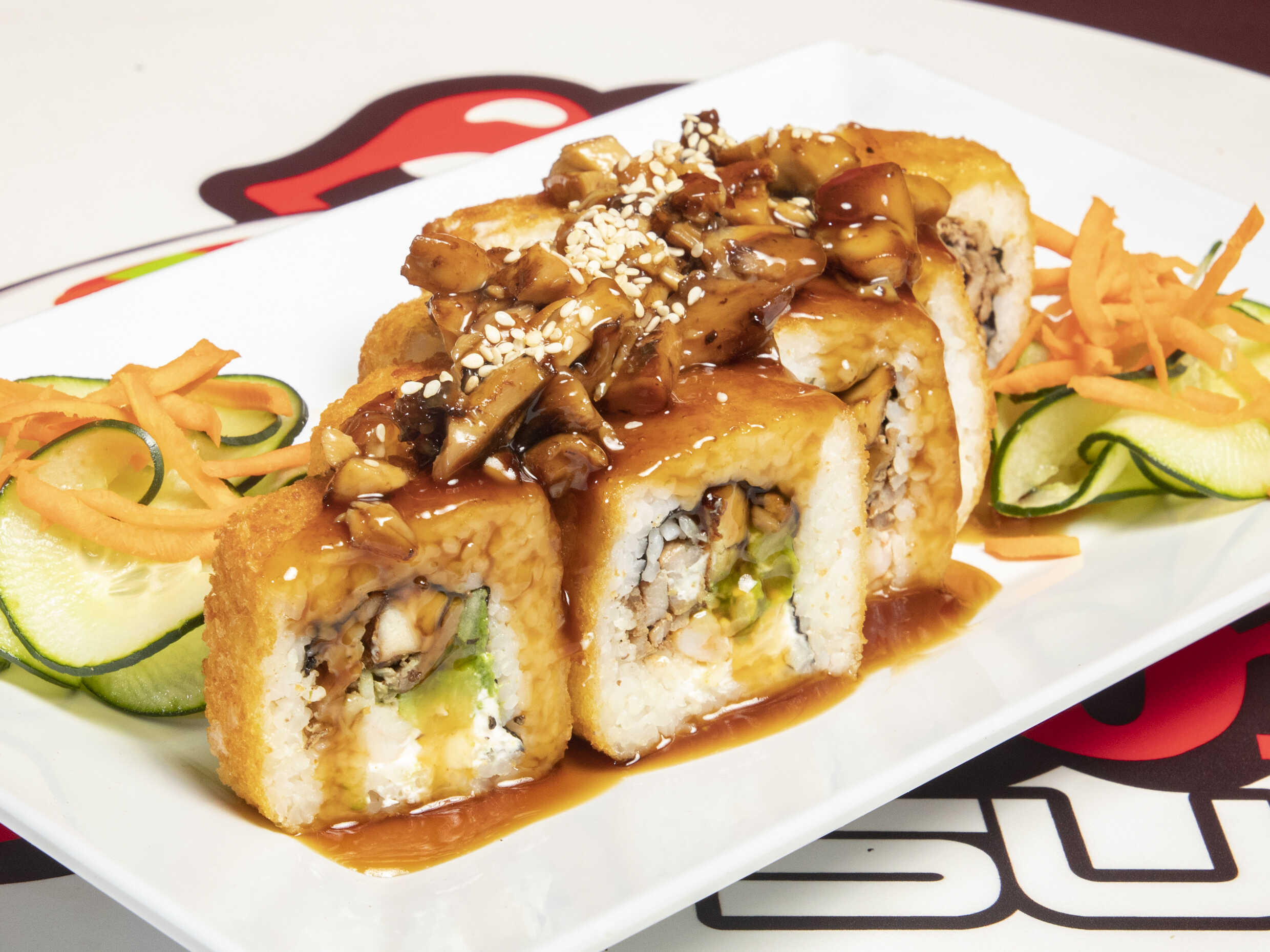 Relleno de pepino, aguacate, queso philadelphia, tampico, cangrejo empanizado con toping de camarón, cebolla y chile quebrado.