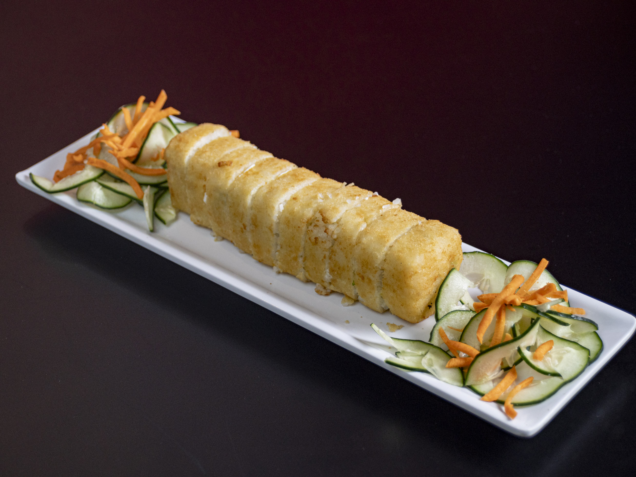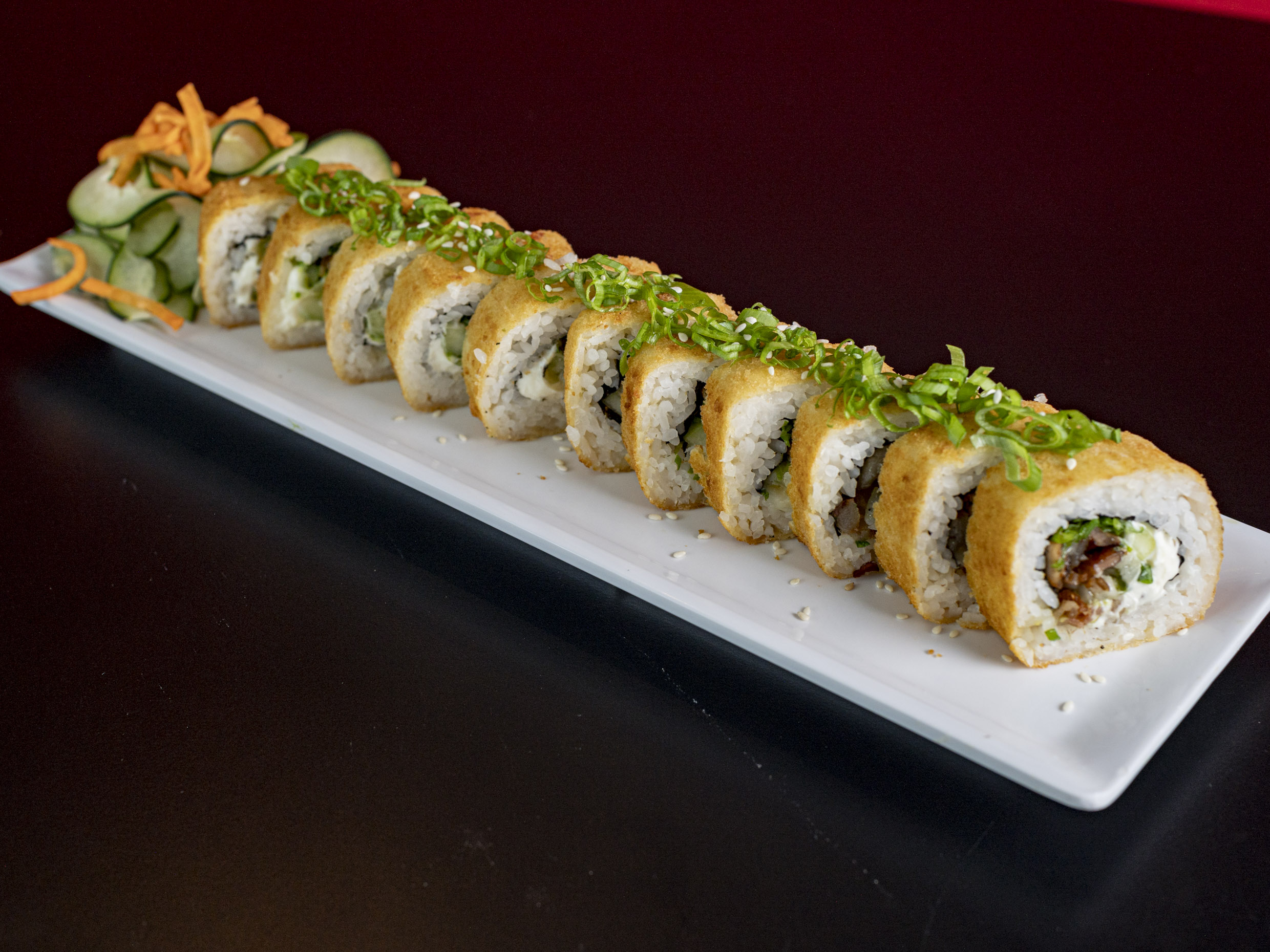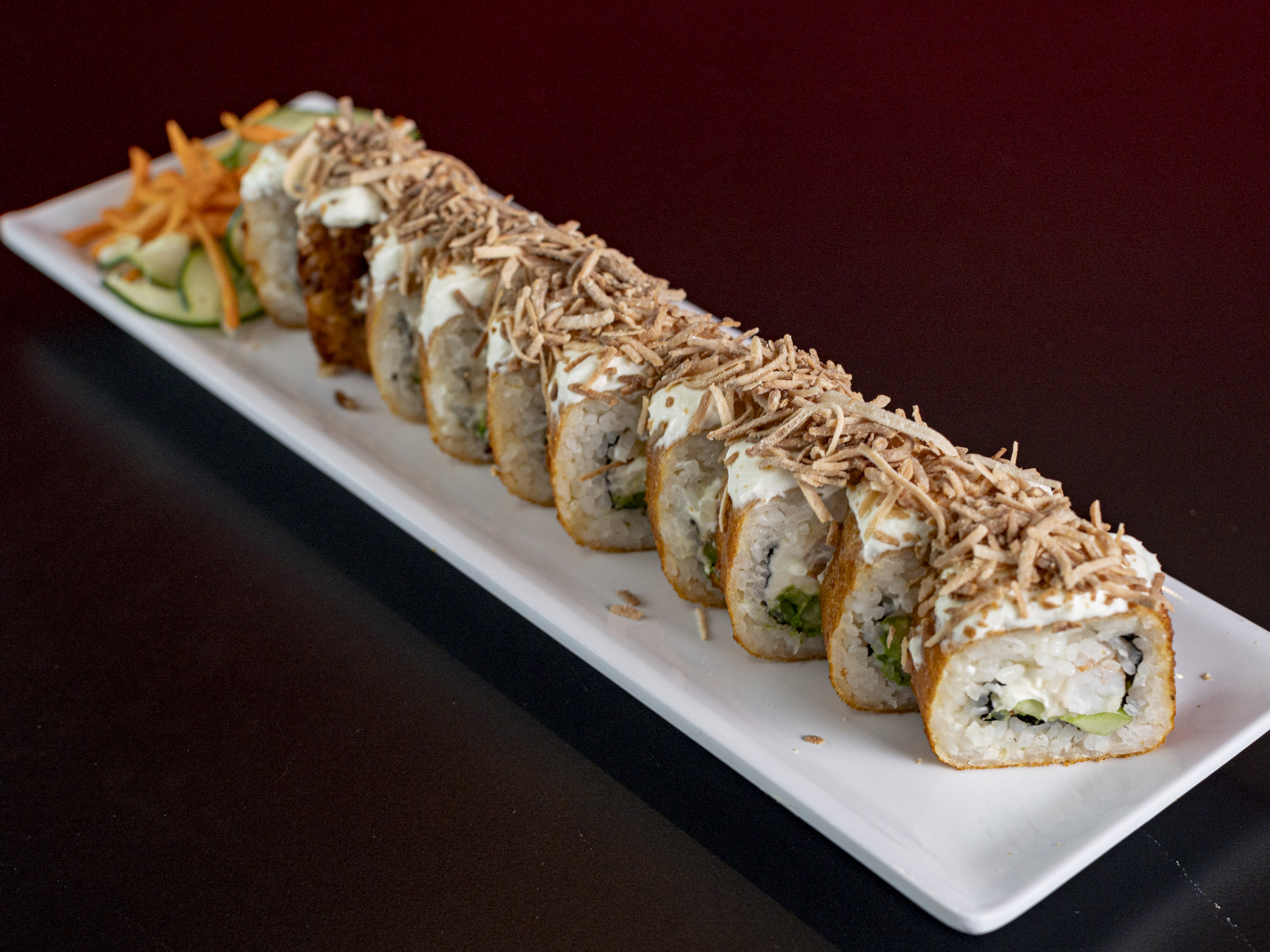 Relleno de pepino, aguacate, queso philadelphia, tampico, cangrejo empanizado con toping de camarón, cebolla y chile quebrado.