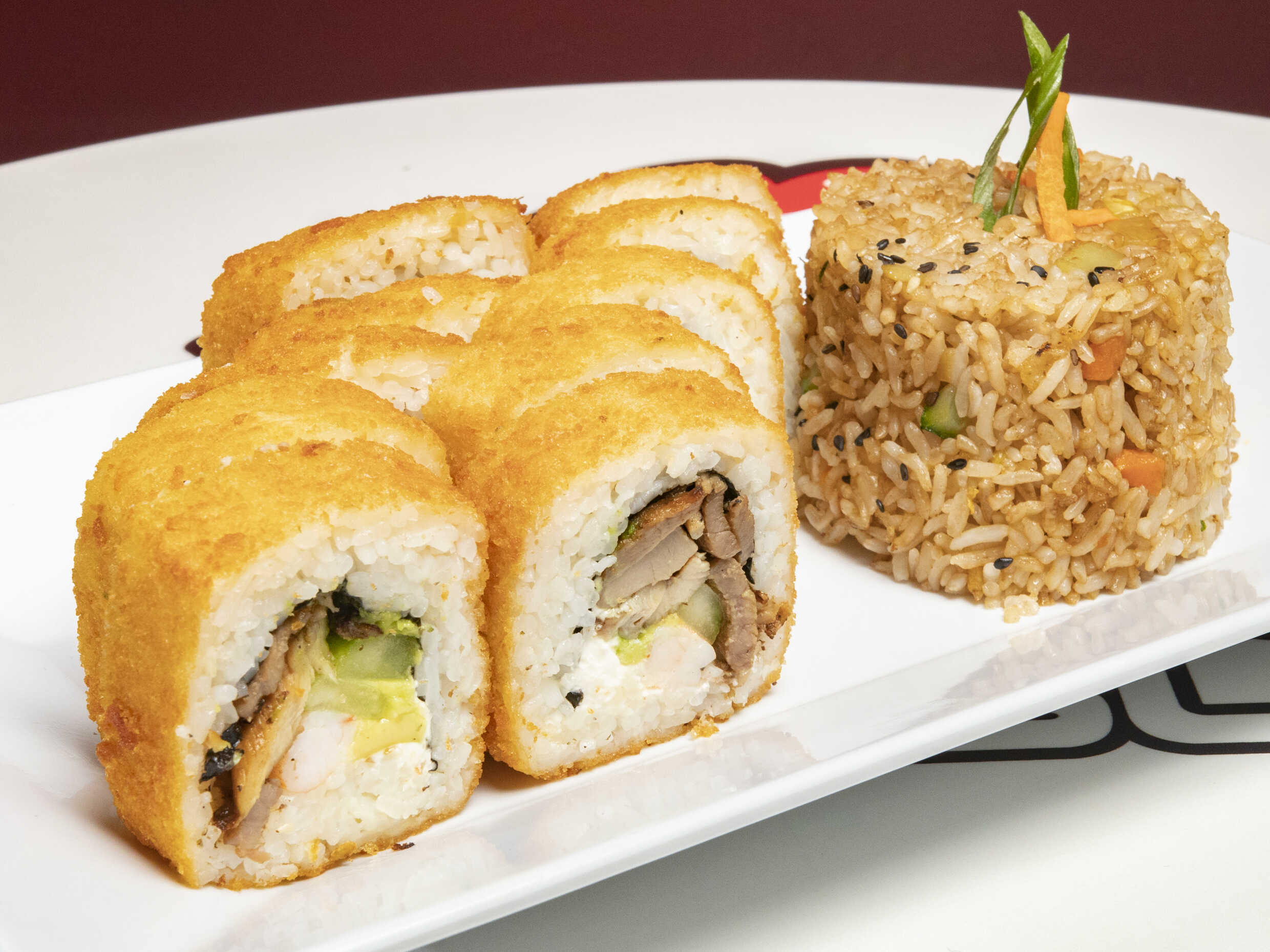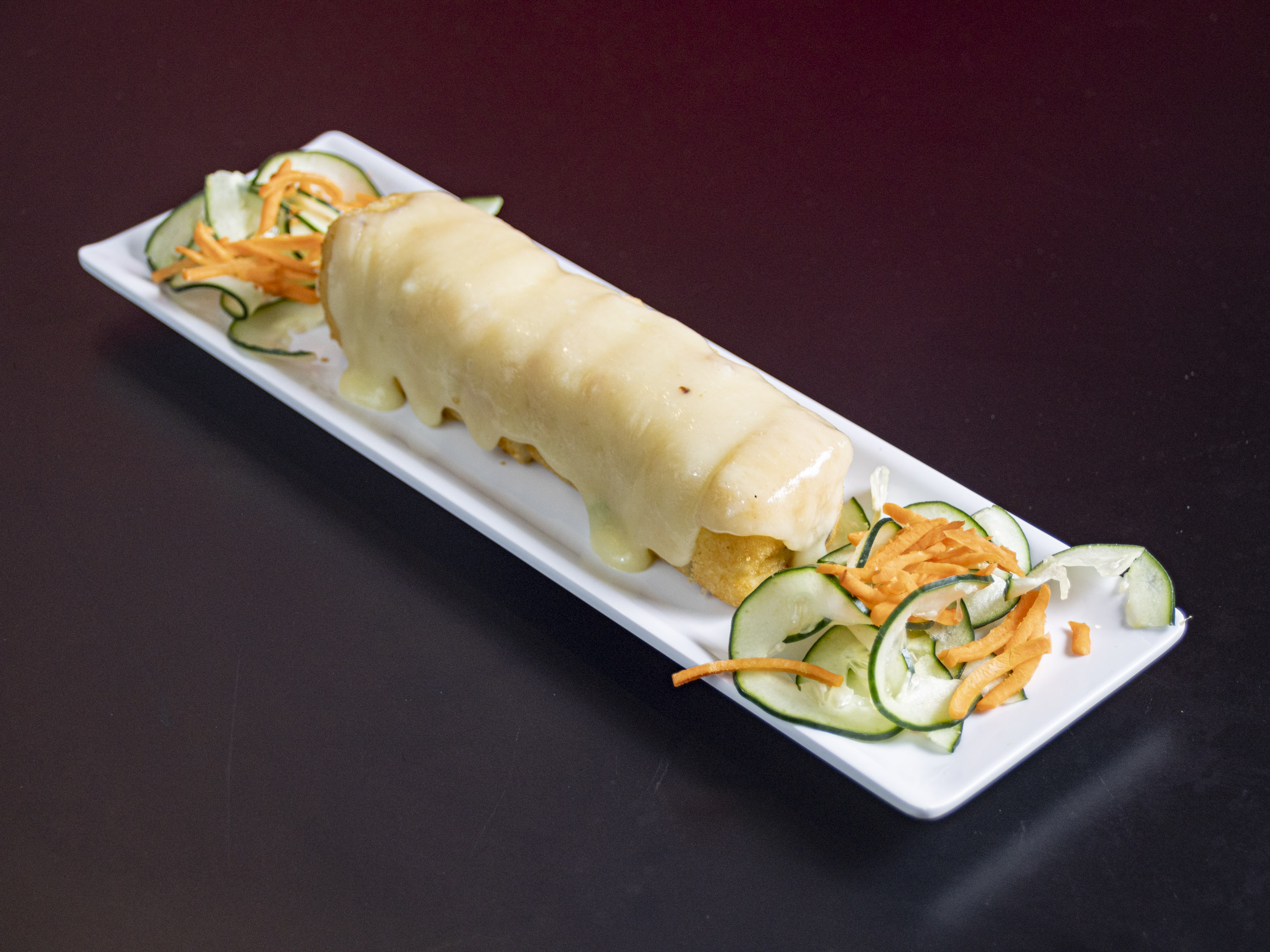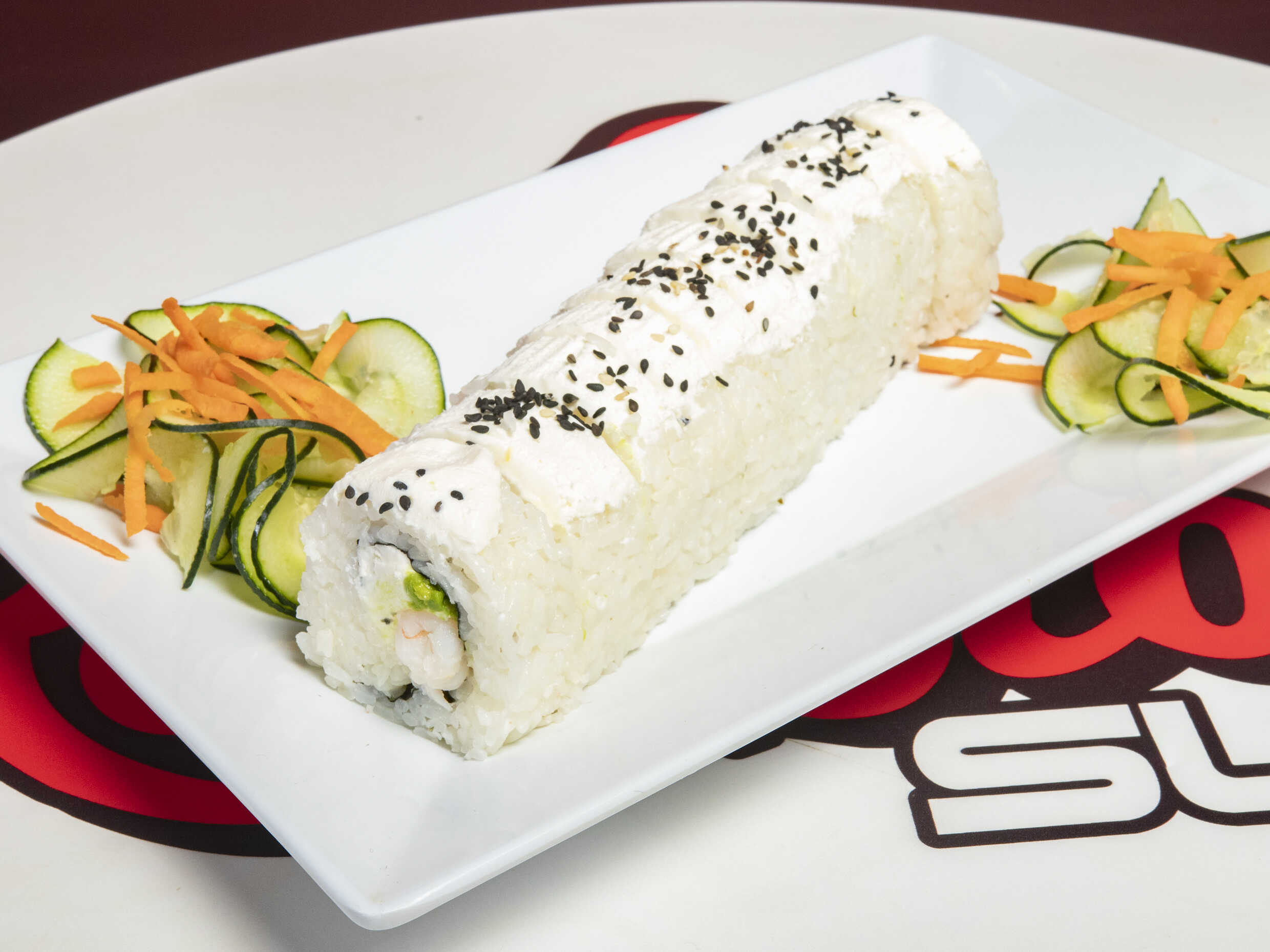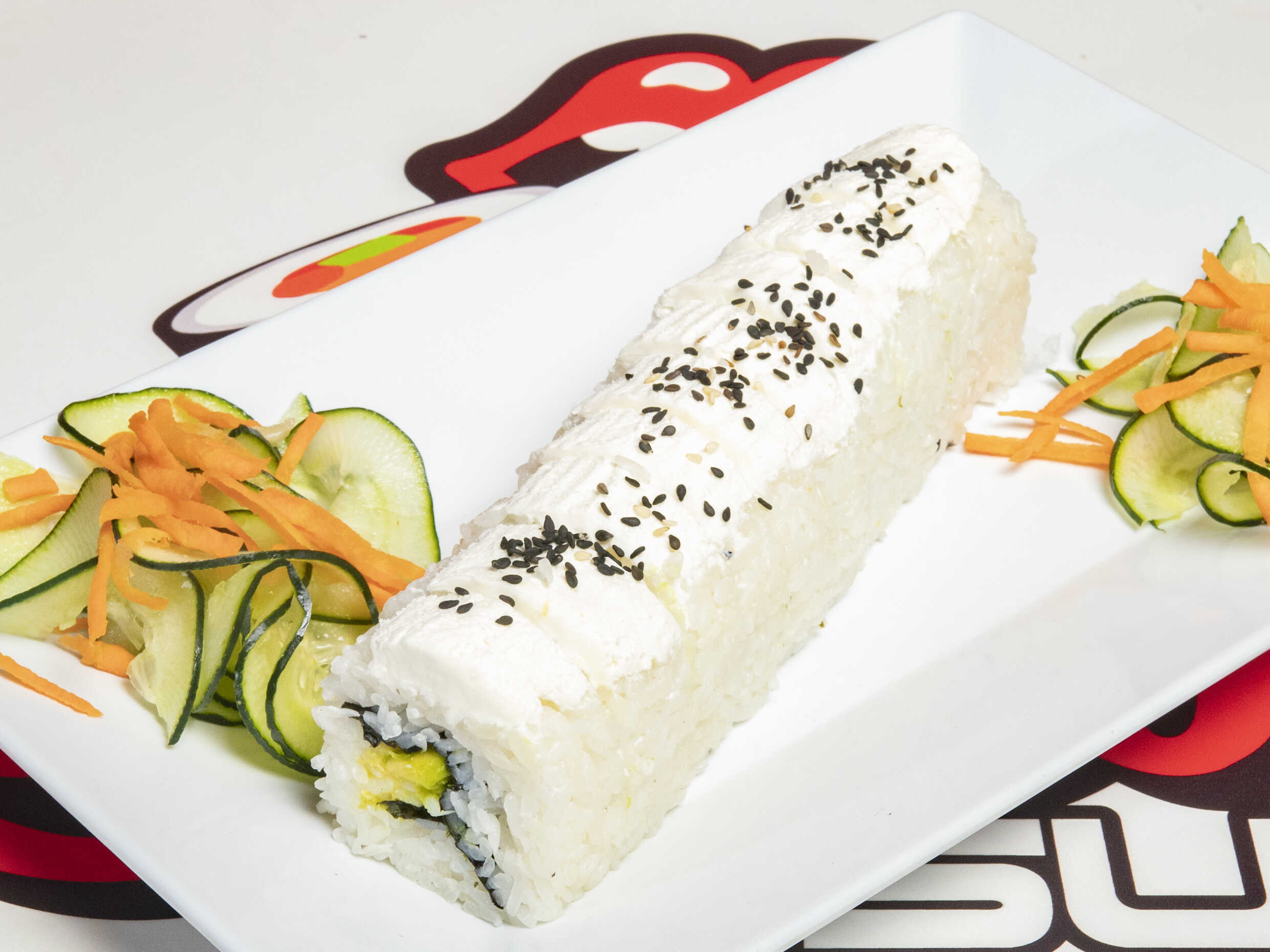 Relleno de verduras frescas, espinaca, zanahoria, forrado de queso Philadelphia y ajonjolí negro.