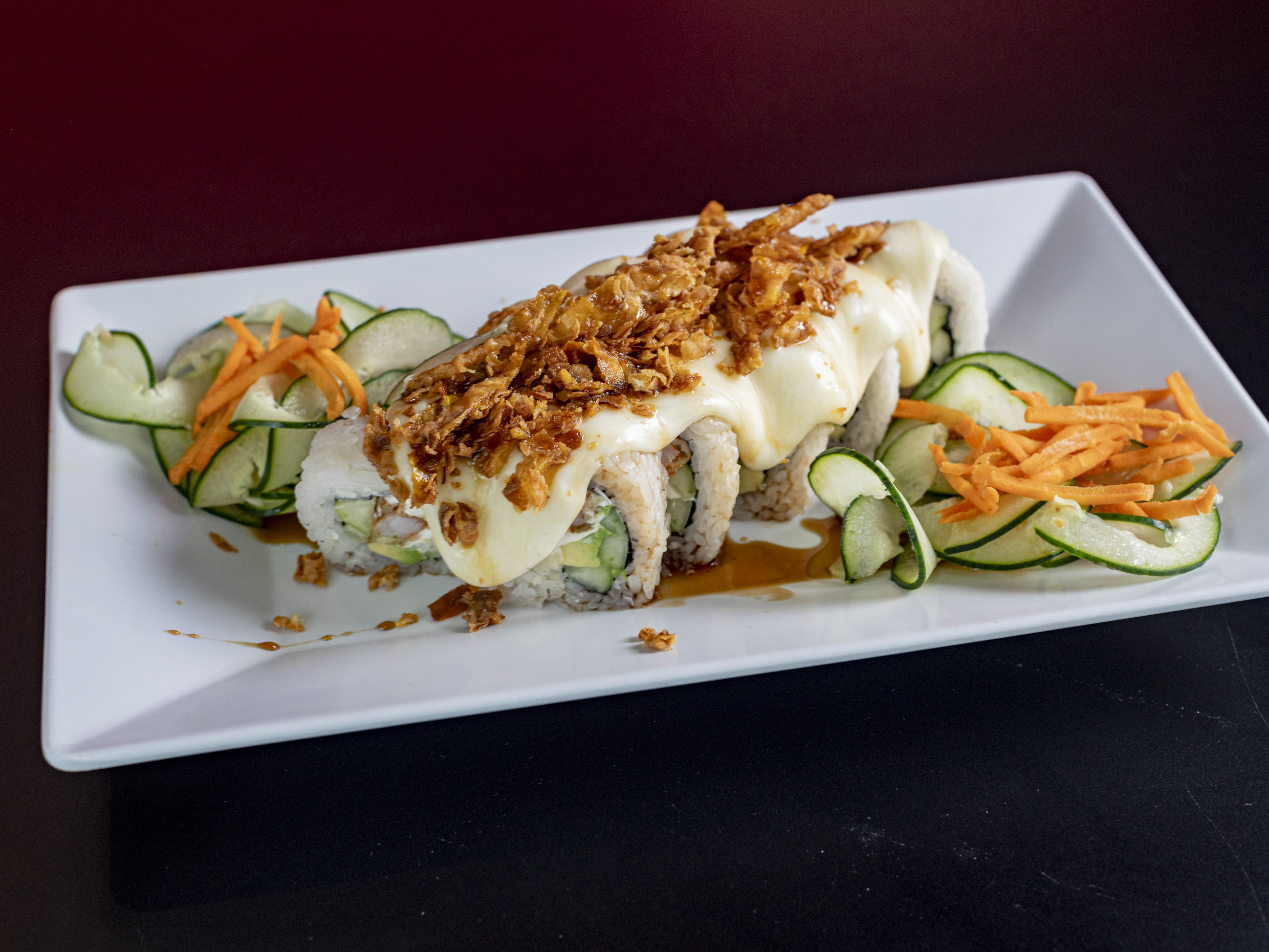 Philadelphia pepino aguacate , camarón empanizado gratinado con toping de salsa spacy siracha y ranch, todo con queso gratinado