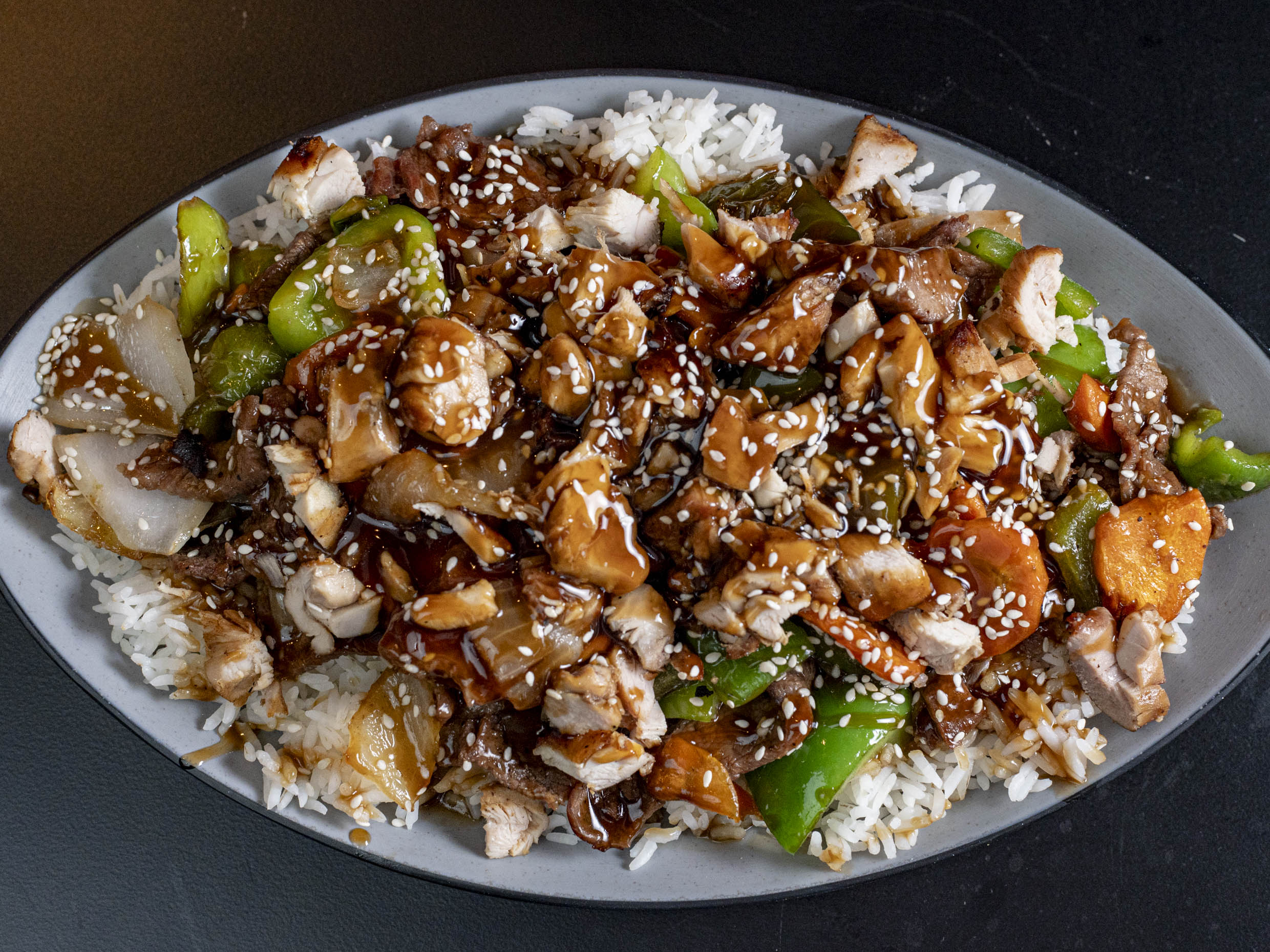 Pollo y res, verduras (morrón, cebolla, zanahoria) cama de arroz blanco.