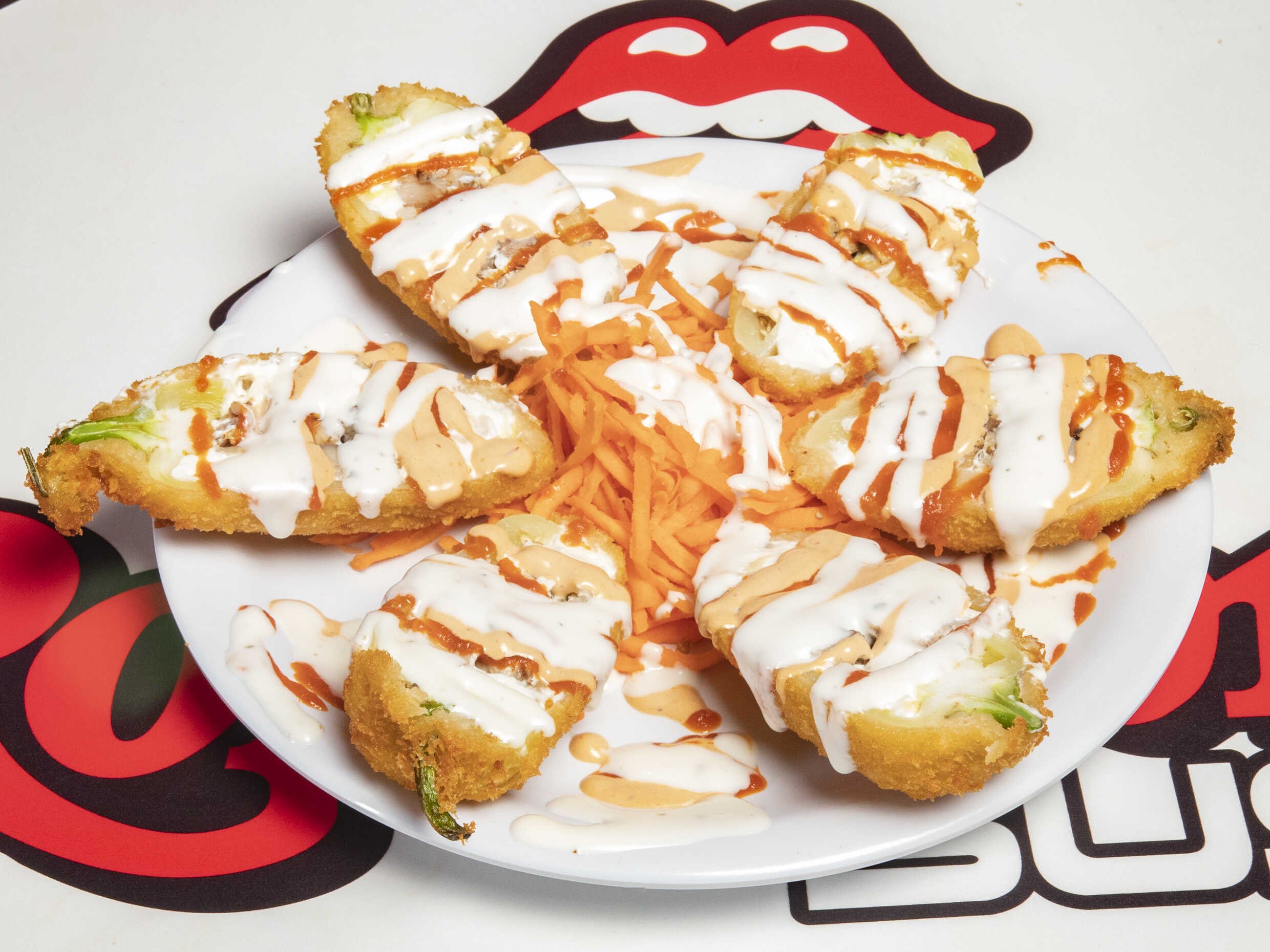 cangrejo, aguacate, queso crema, con topping de tampico, bolitas de queso y aderezo en salsa siracha y ranch