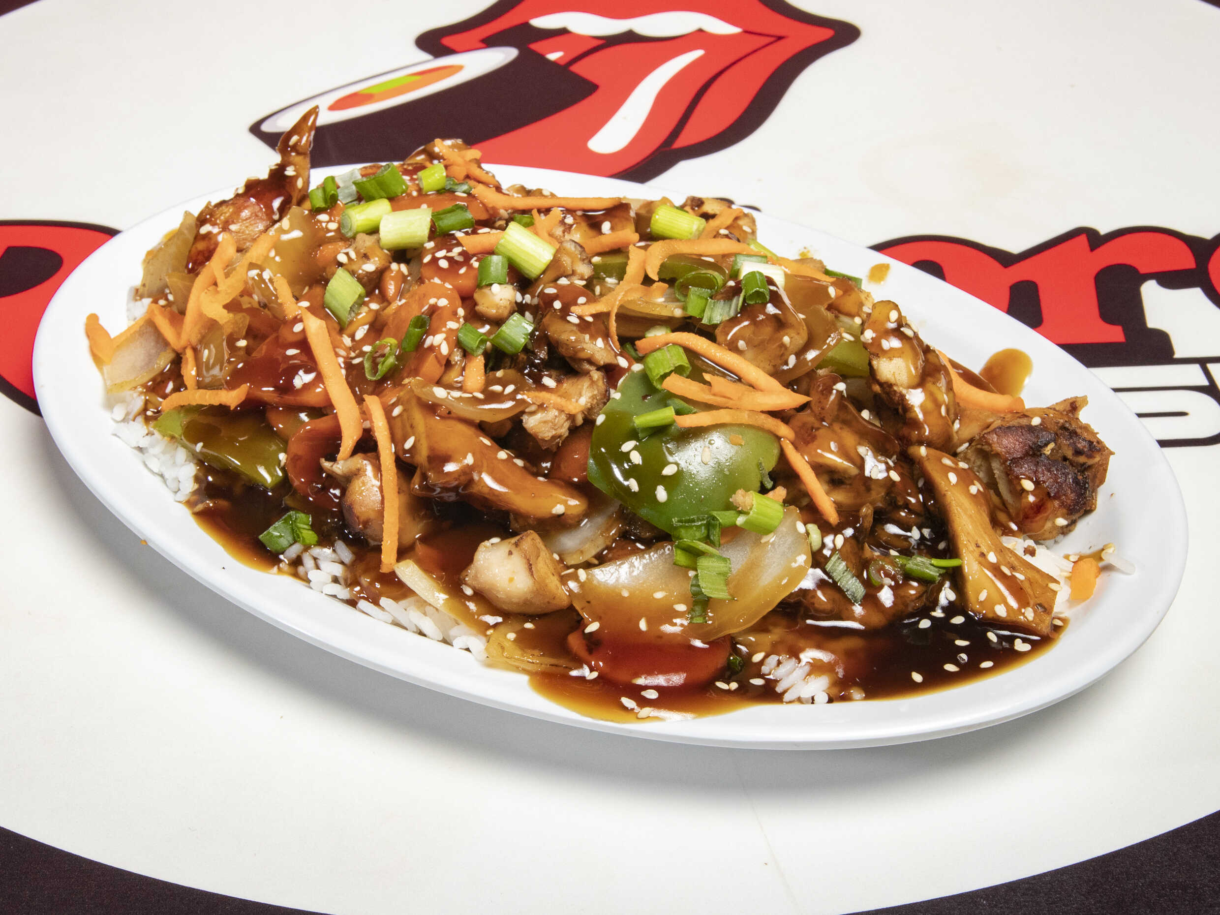 Pollo en salsa teriyaki sobre cama de arroz blanco, aderezo chipotle y chiles toreados.