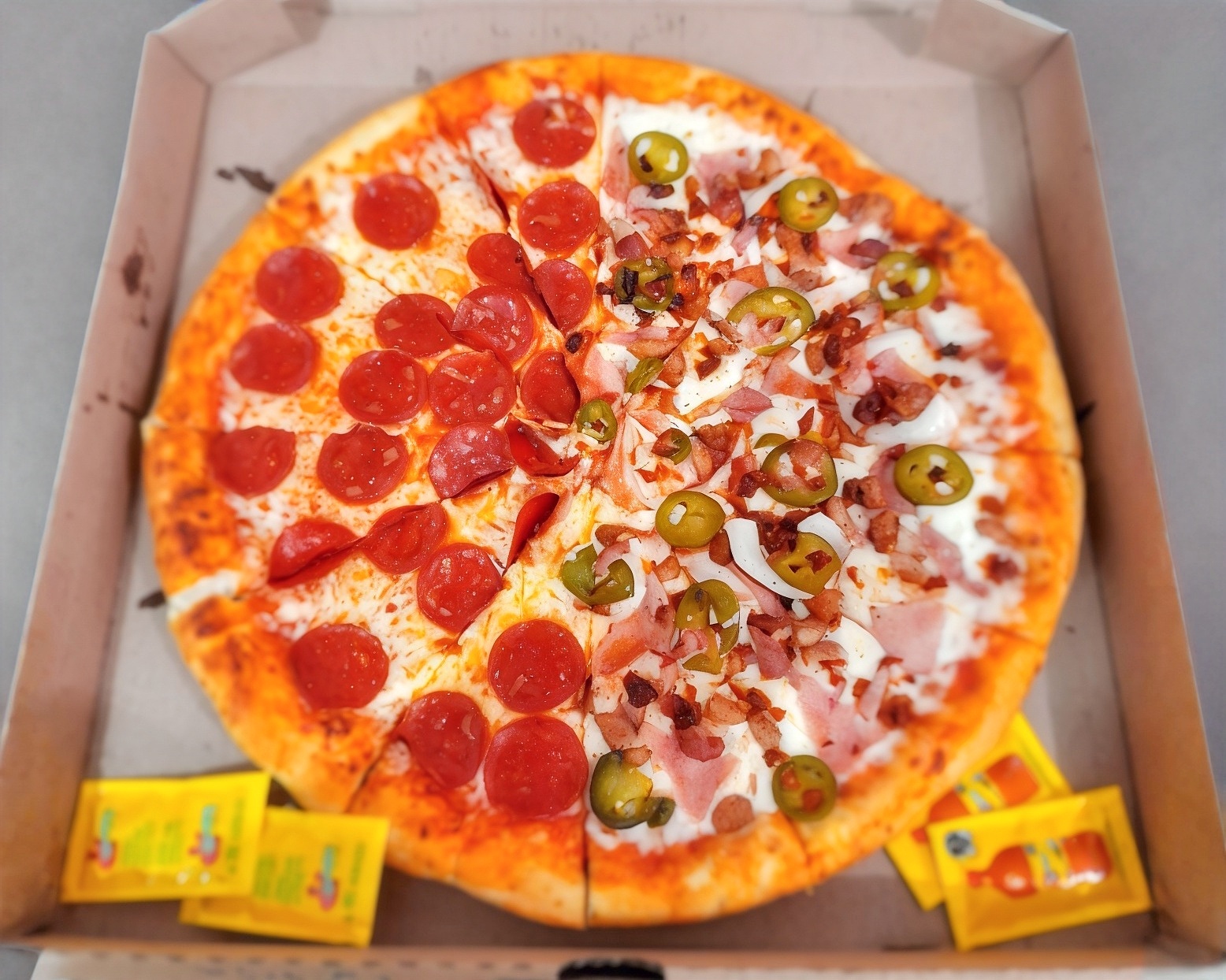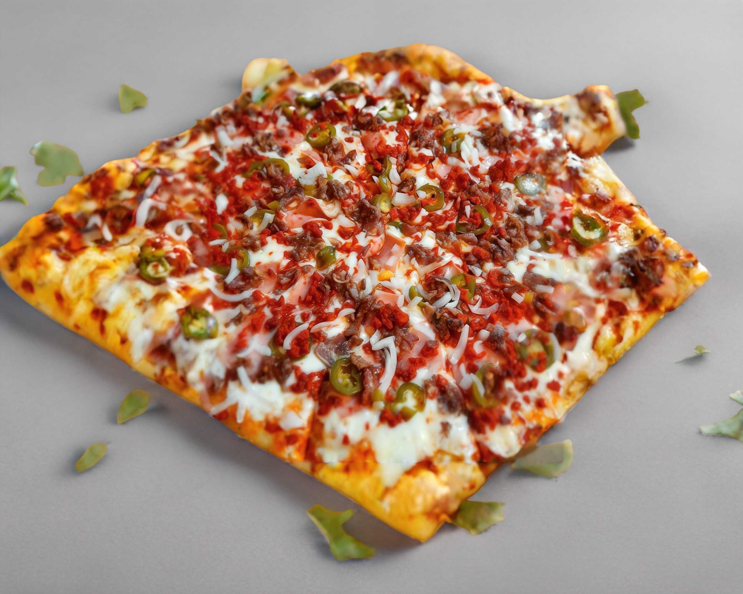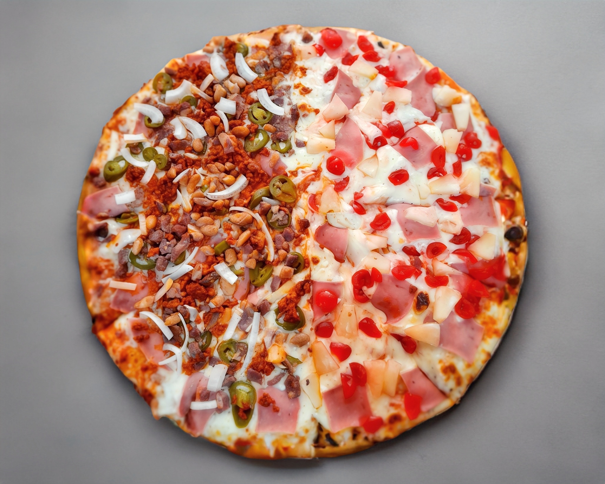 Salsa de tomate, queso mozzarella, jamón, jalapeño, tocino, chorizo y cebolla