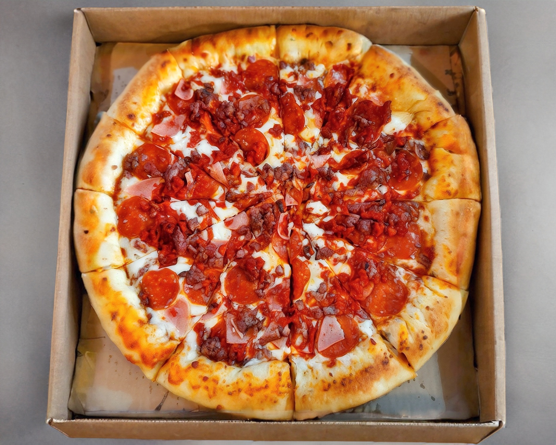 Salsa de tomate, queso mozzarella, pepperoni, jamón, tocino y chorizo