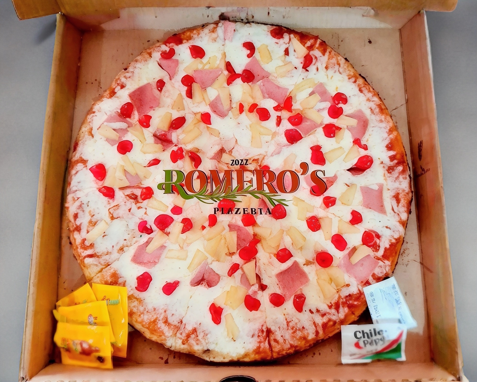 Salsa de tomate, queso mozzarella, jamón, piña y Cherry