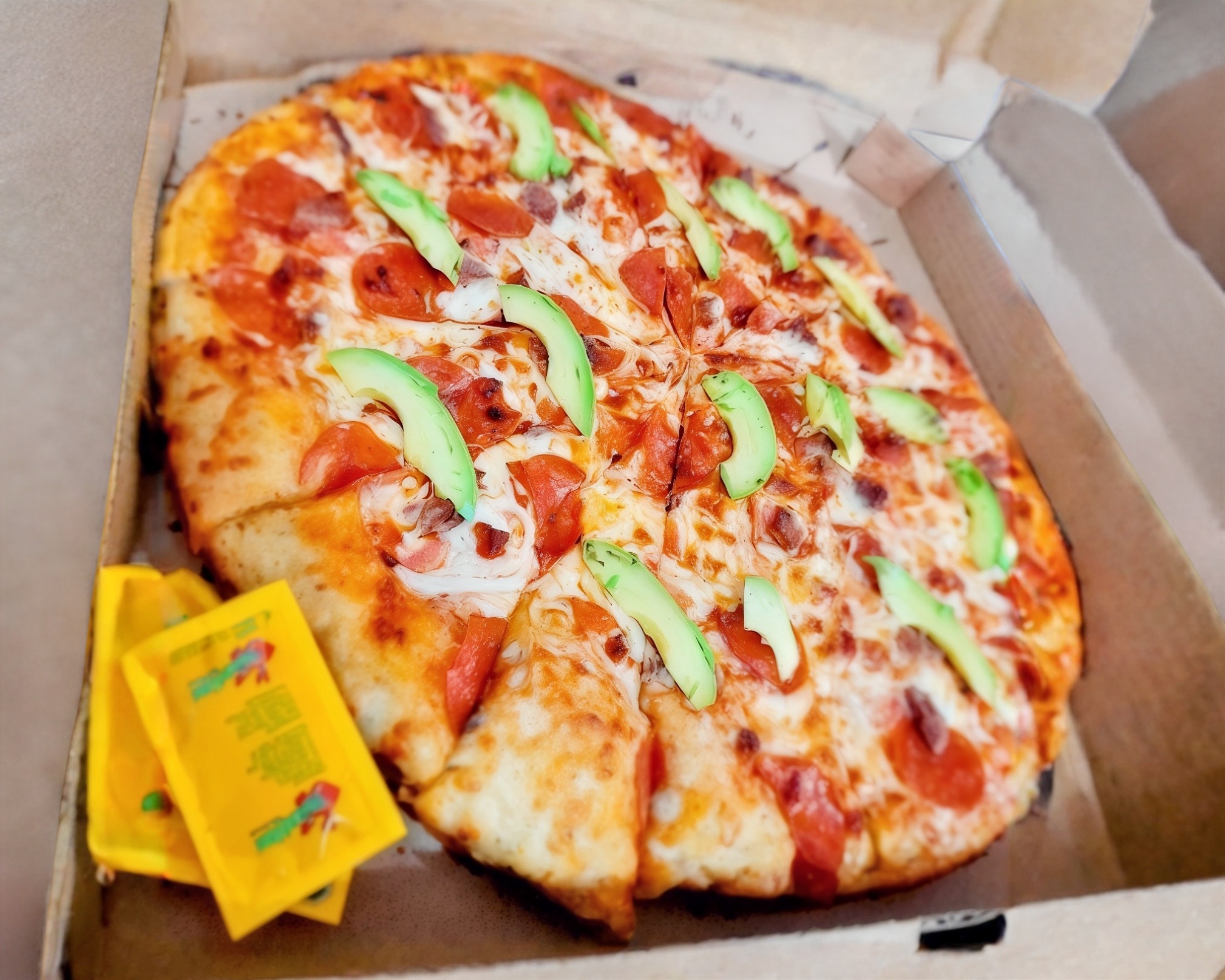 Salsa de tomate, queso mozzarella, pepperoni,chorizo, tómate,cebolla y aguacate