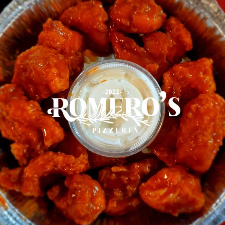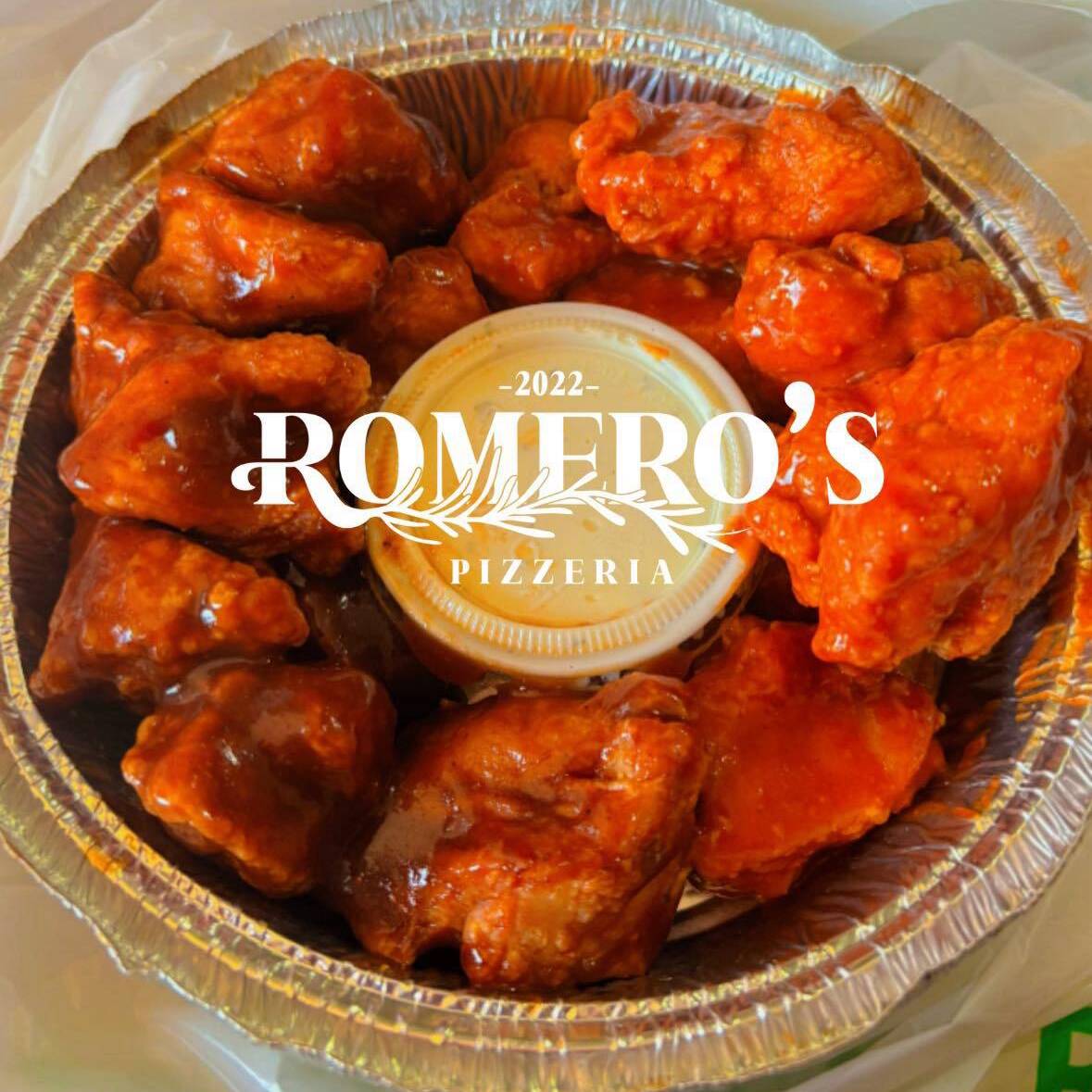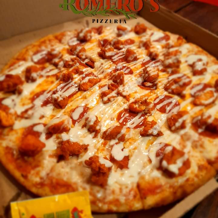 Salsa de tomate,queso mozarella,pepperoni,boneless bañados em salsa bufalo y coronados con aderezo rach