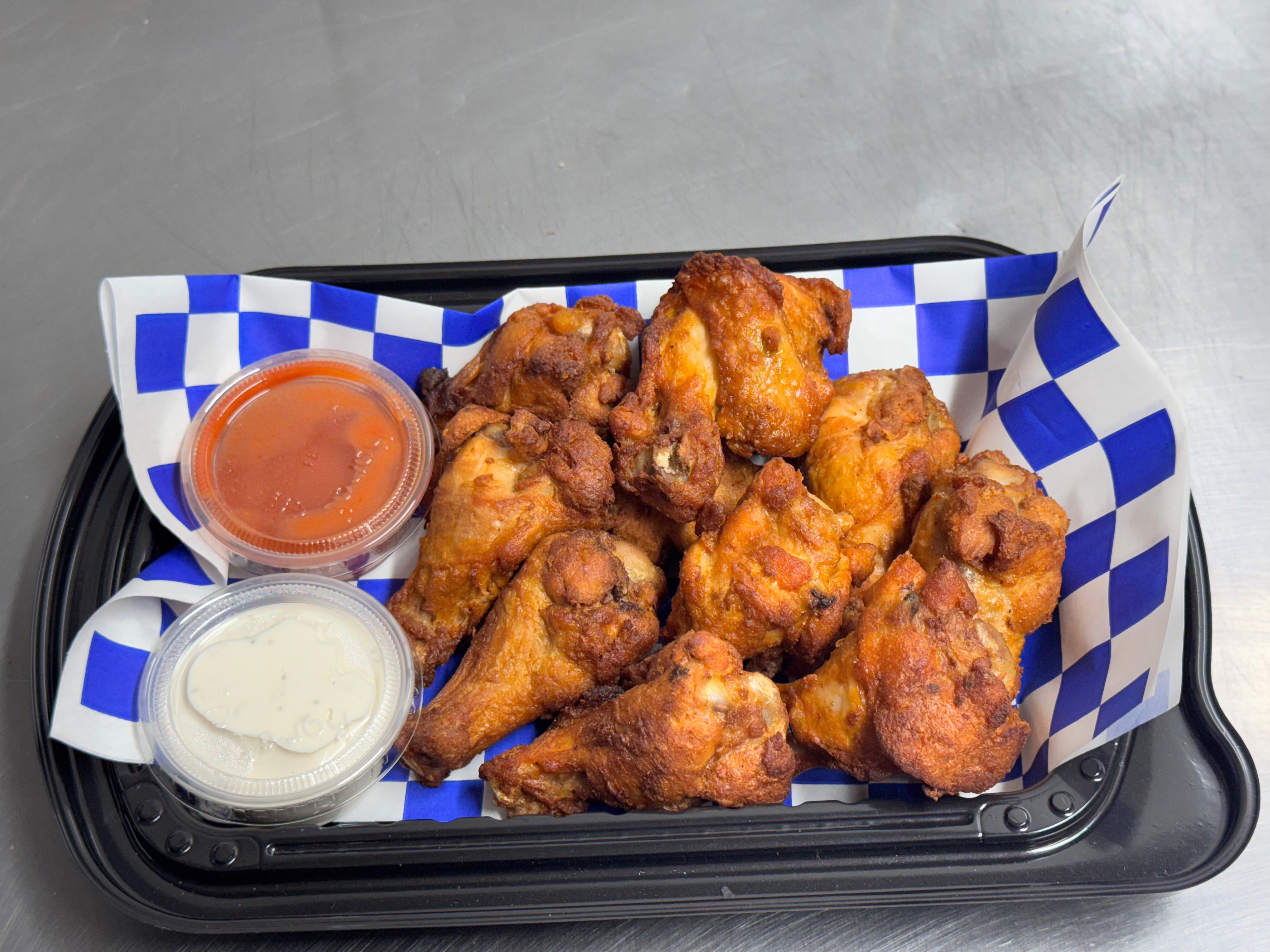Orden de 10 pzas de alitas acompañada con apio, zanahoria y un aderezo ranch.