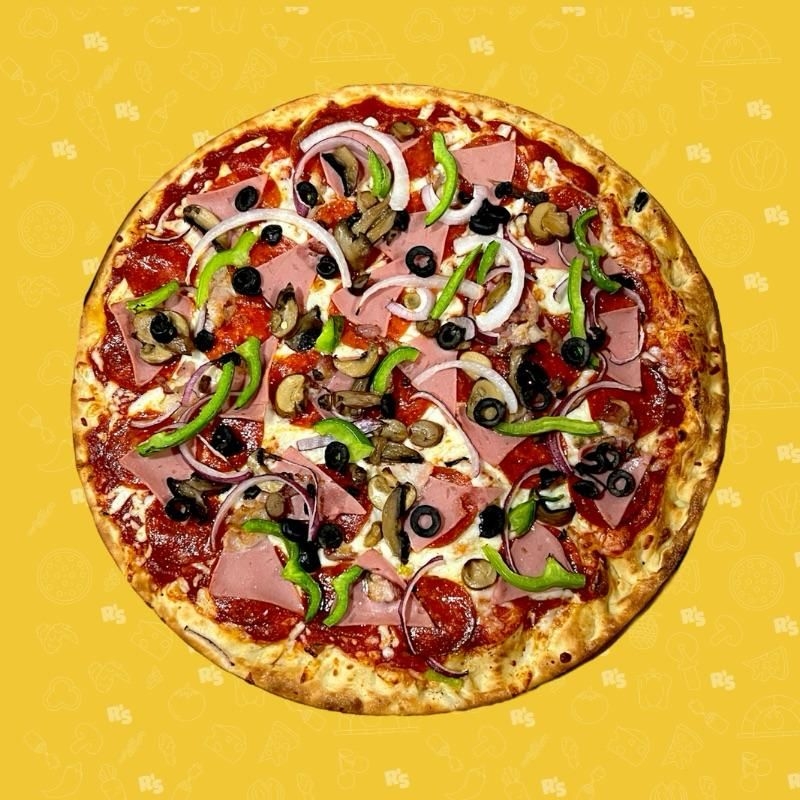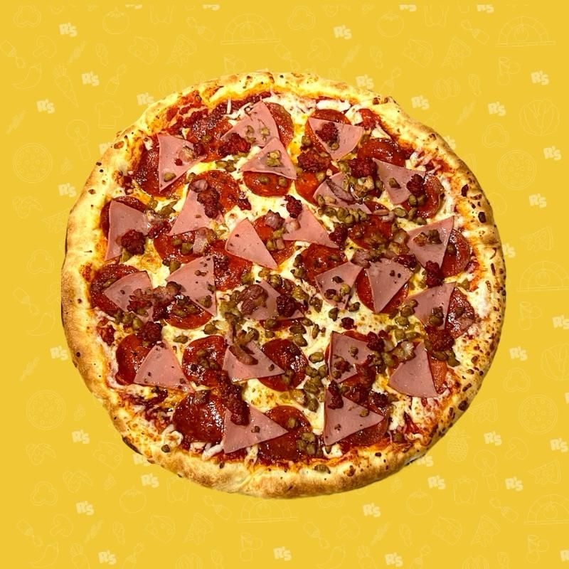 Pollo, tocino, jamón, morrón, cebolla y queso mozzarella.