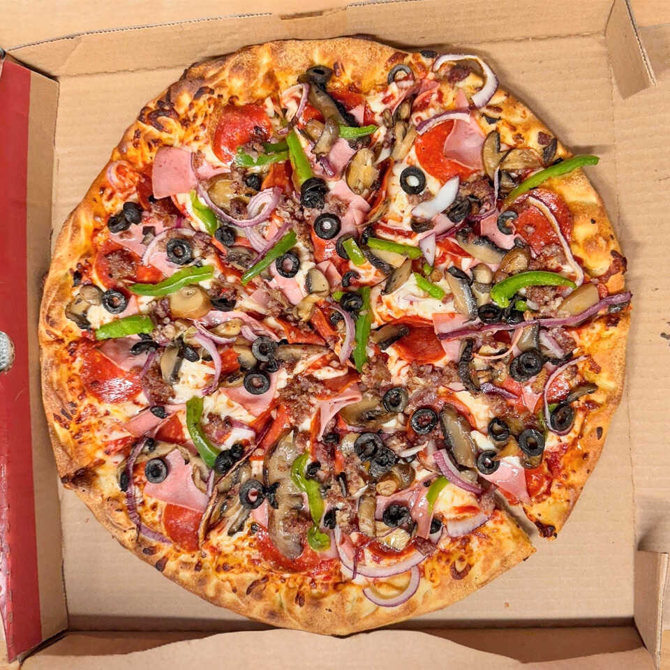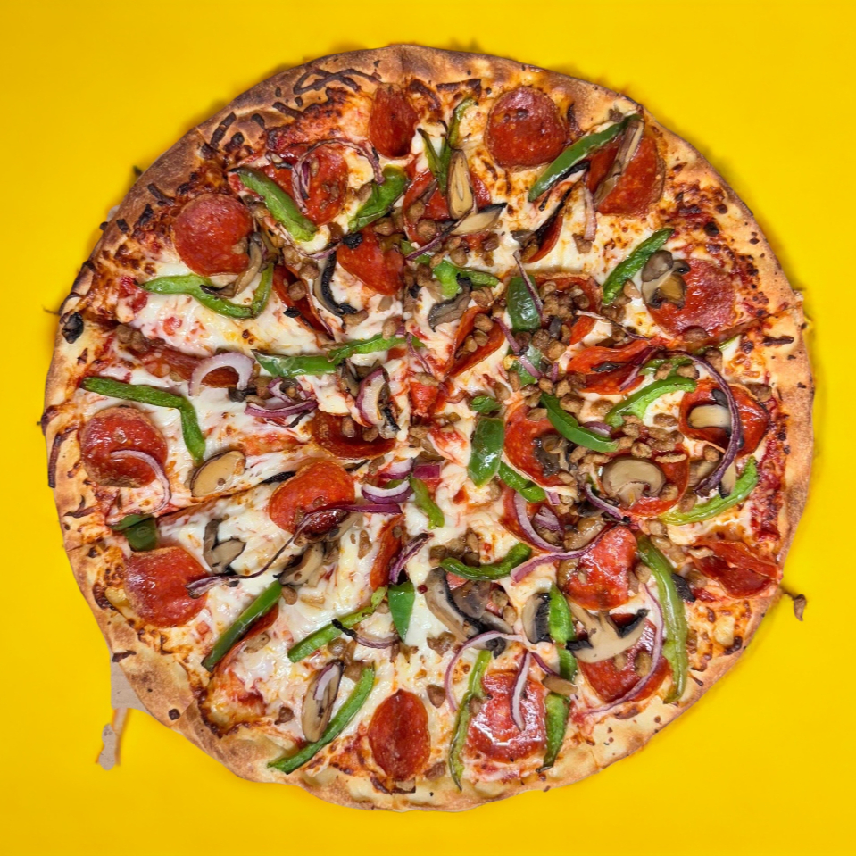Pollo, tocino, jamón, morrón, cebolla y queso mozzarella.