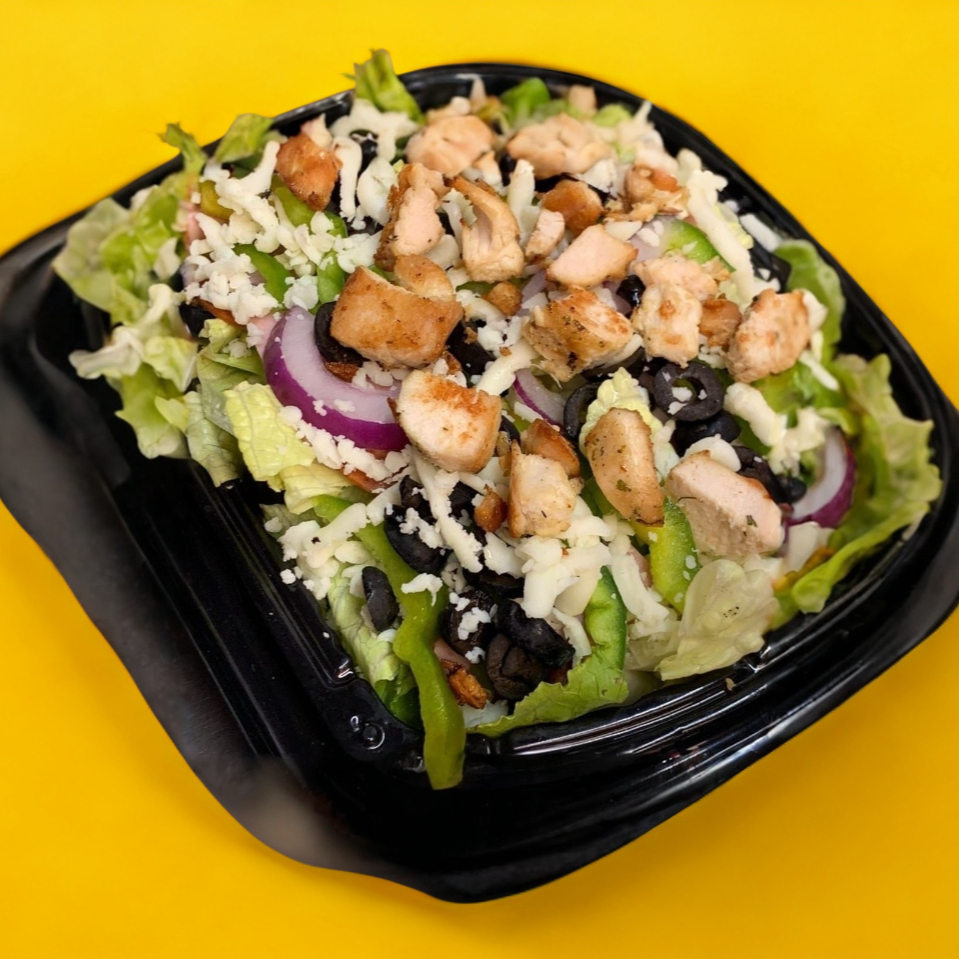 Lechuga, pepperoni, jamón, morrón, cebolla, champiñón, aceituna, tomate cherry, pepino, queso mozzarella, crotones y aderezo.