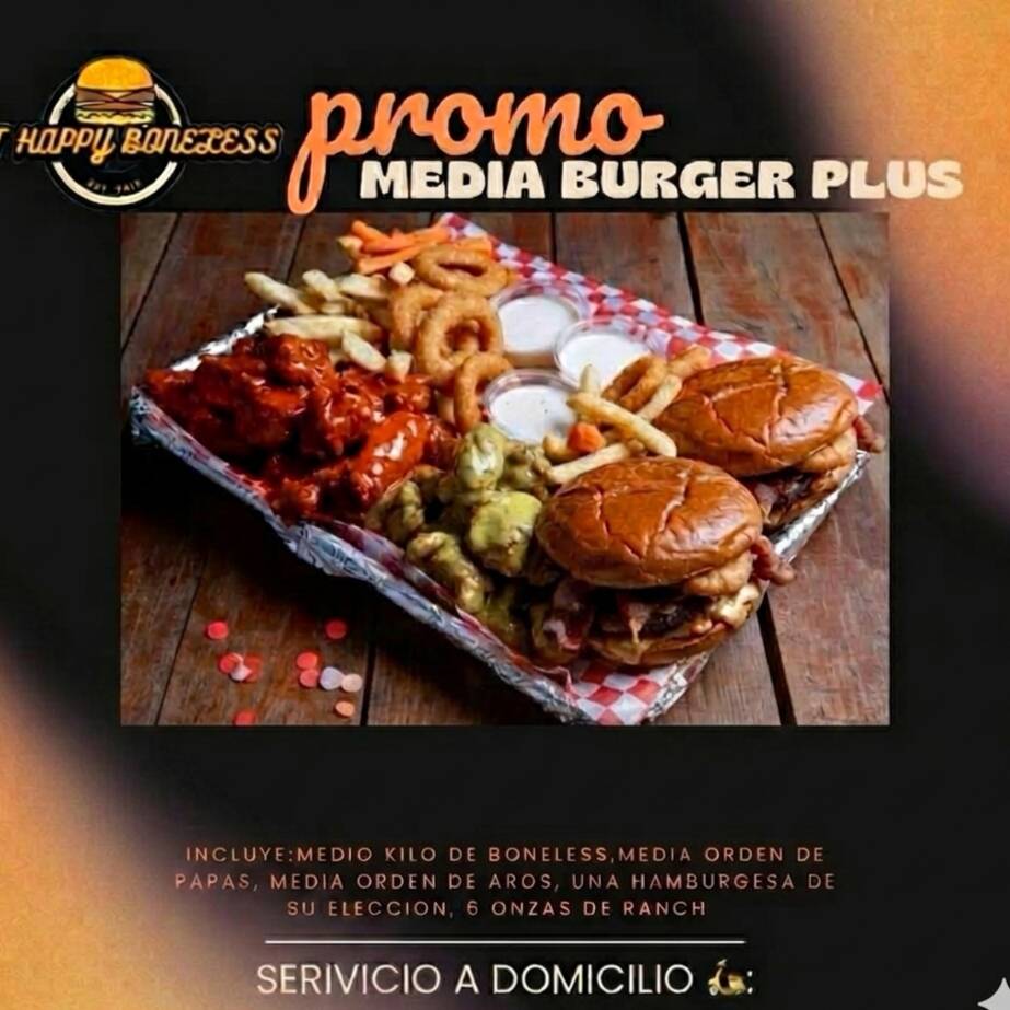 2 hamburgesas western, medio kilo de boneless en salsas de tu eleccion , media orden de papas, media orden de aros , 6 onzas ranch , bastones de zanahoria.