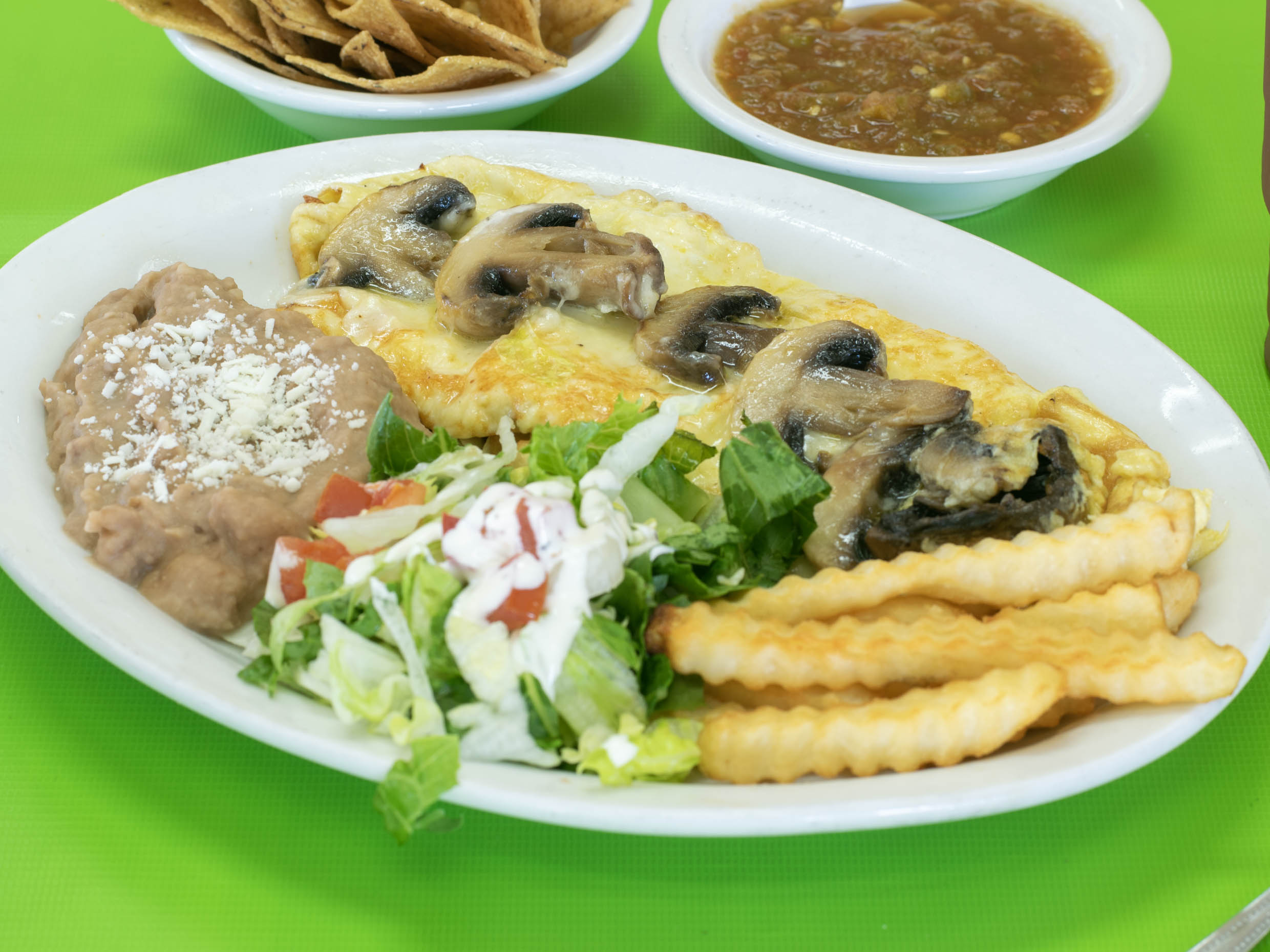 Acompañados de frijoles, ensalada y papas fritas.