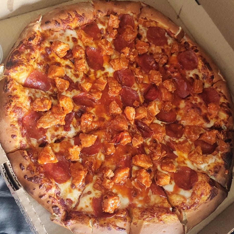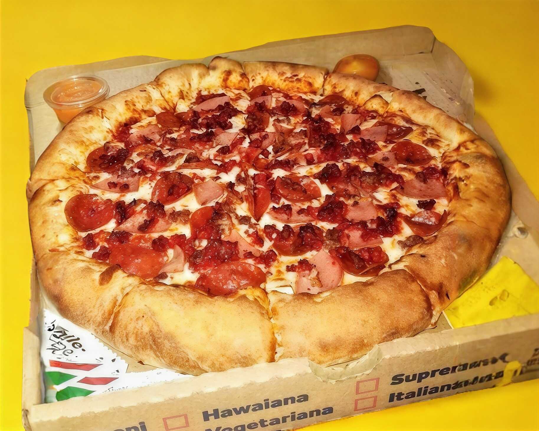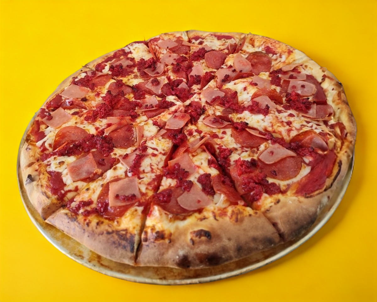 pizza de 16'' cortada en 12 pedazos. peperoni,jamon,chorizo y tocino.
