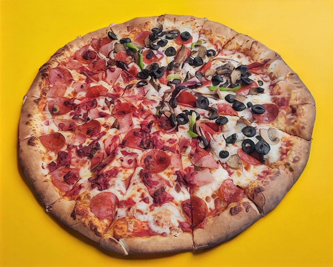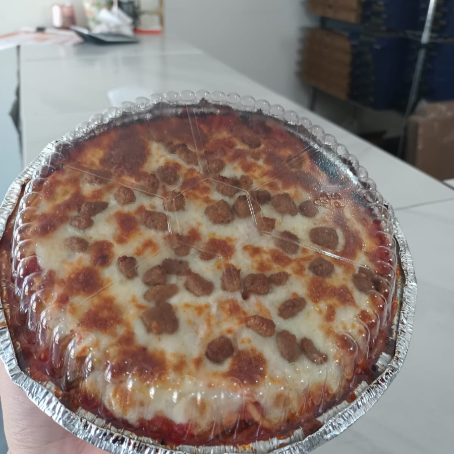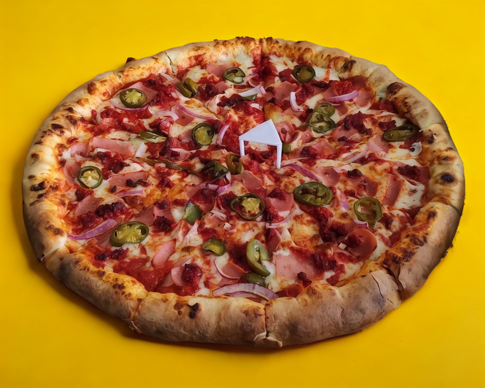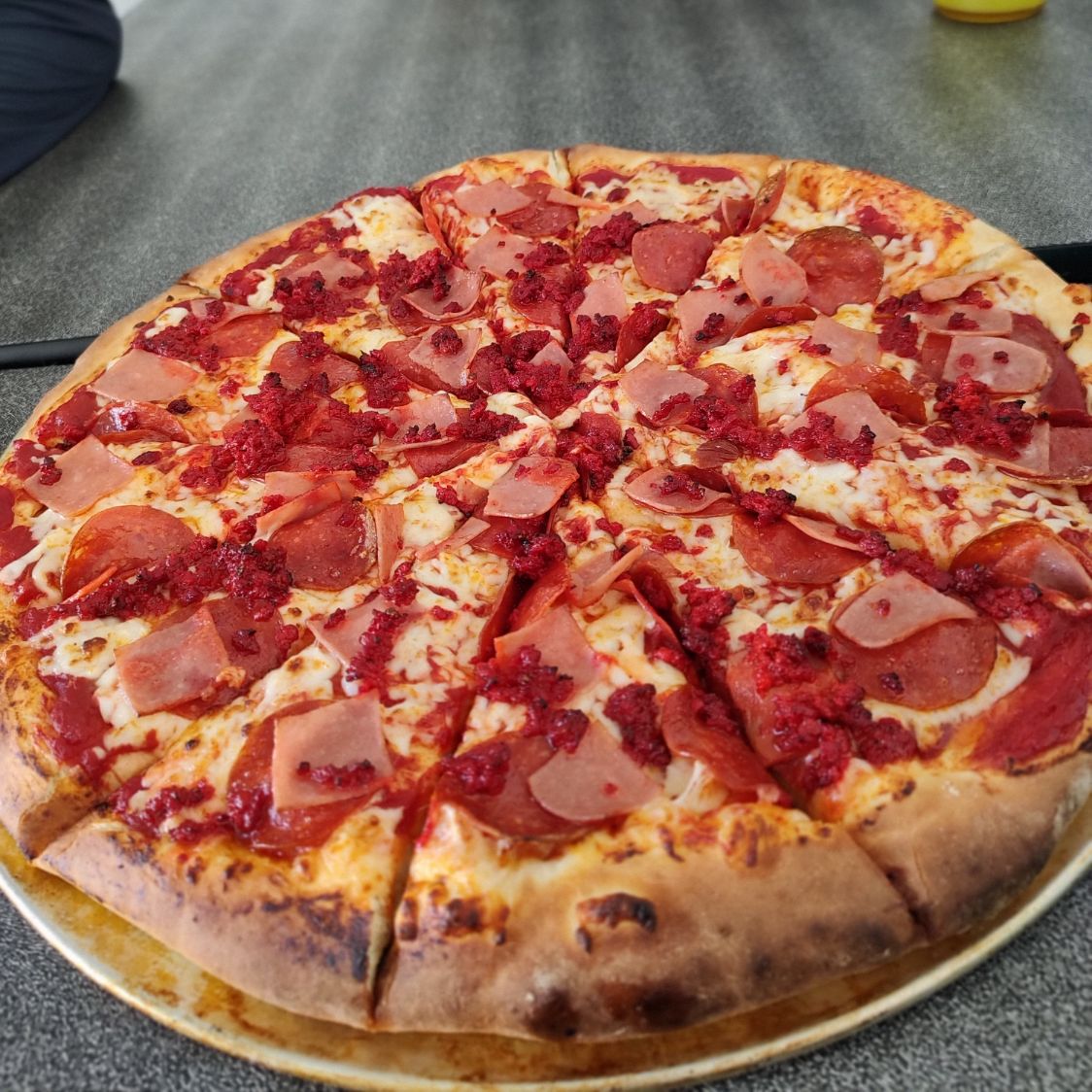 pizza de 16'' cortada en 12 pedazos. peperoni,jamon,chorizo y tocino.
