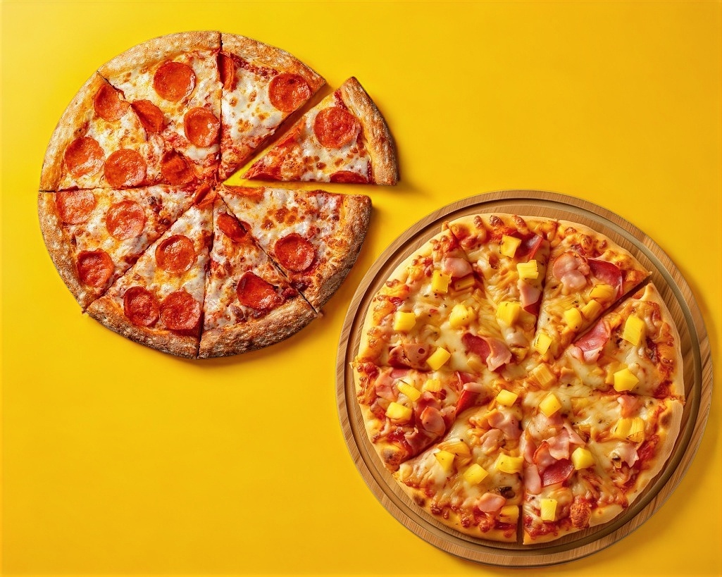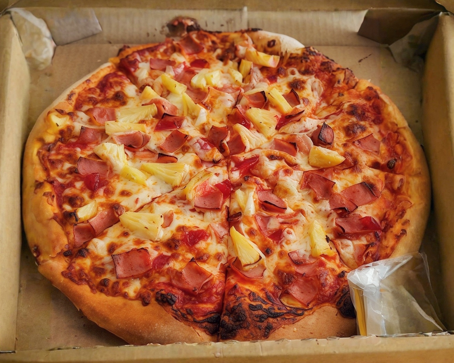 pizza de 12'' cortada en 8 pedazos. jamon,piña.