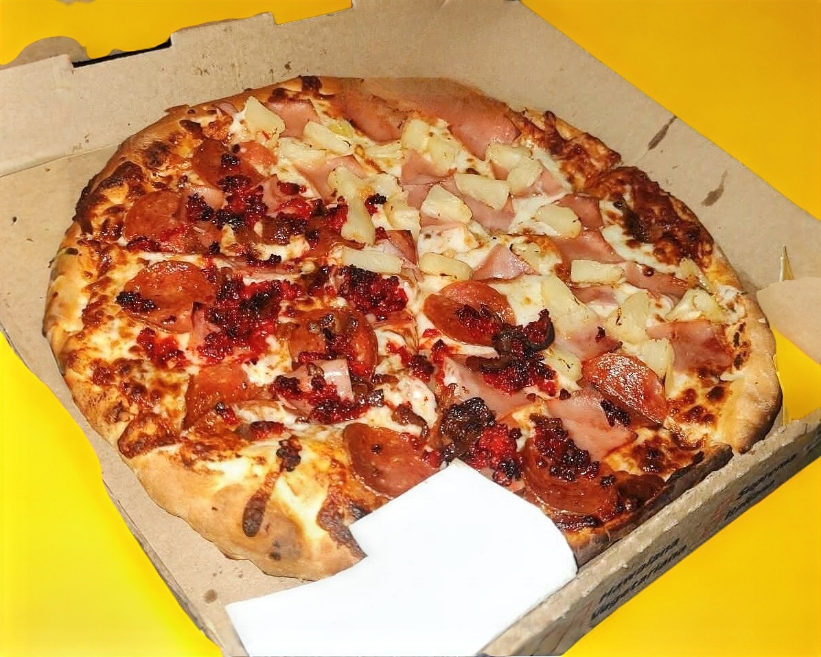 pizza de 12'' cortada en 8 pedazos. peperoni,jamon,chorizo tocino.