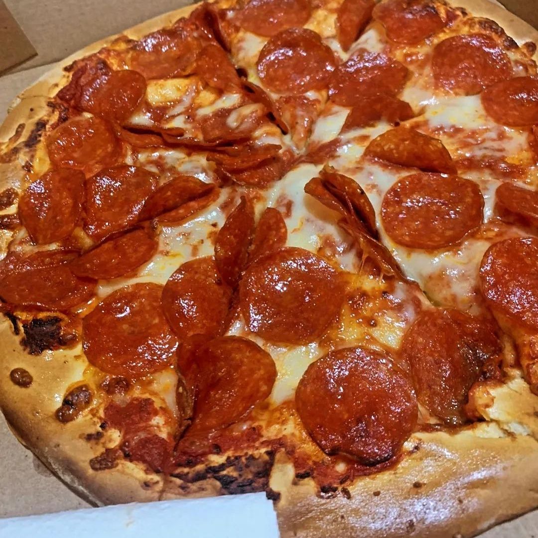 Pizza de 16" cortada en 12 piezas, preparada con salsa de tomate, queso mozzarella y pepperoni
