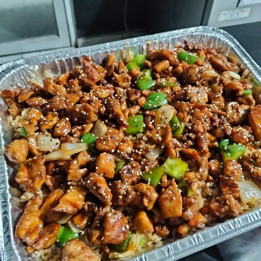 Cama de arroz blanco, con pollo, con cebolla y morrón, glaseado en salsa teriyaki.