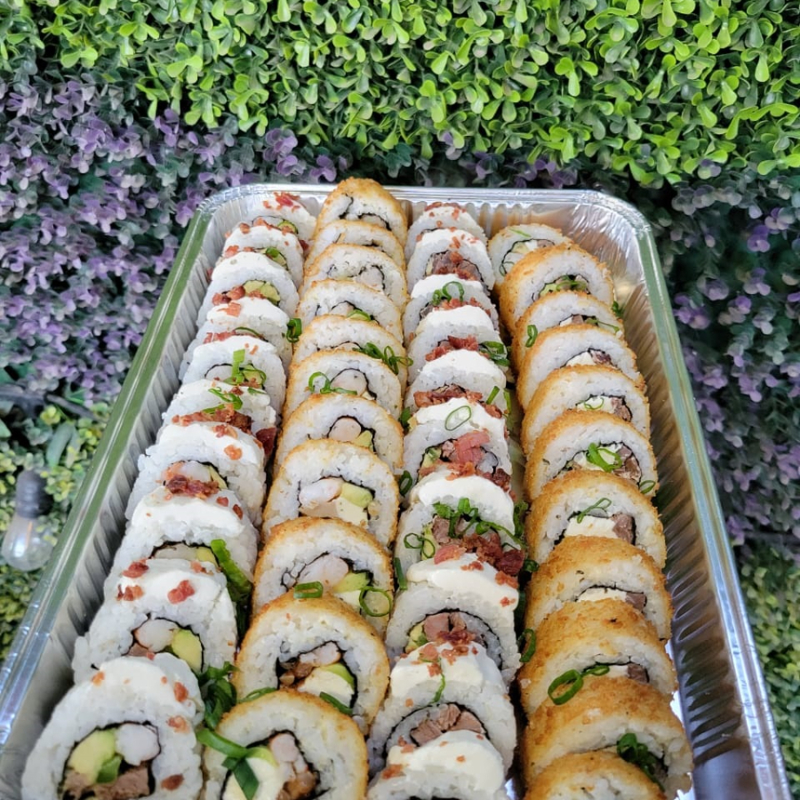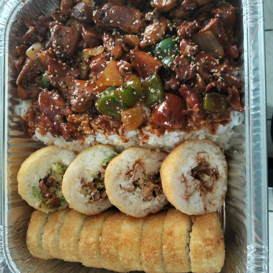 1/2 Charola de Teriyaki, 2 Rollos Cheese Bacon