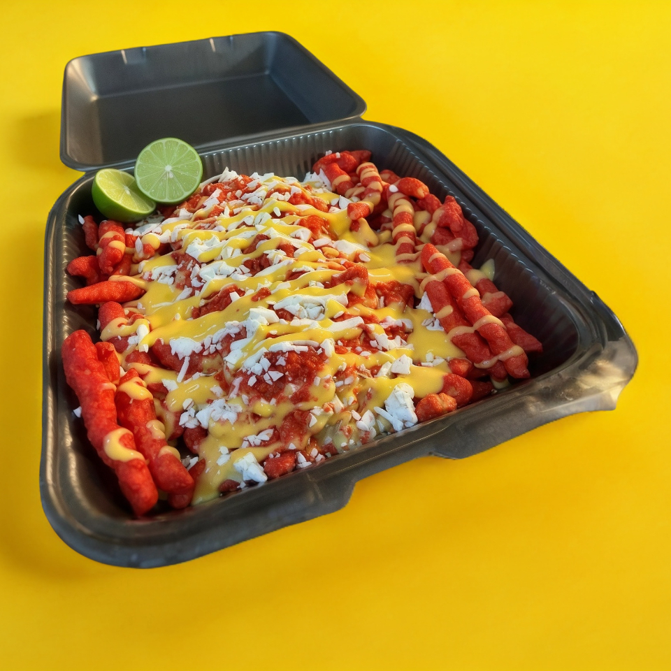 chetos flaming hot, queso amarillo y queso cotija.