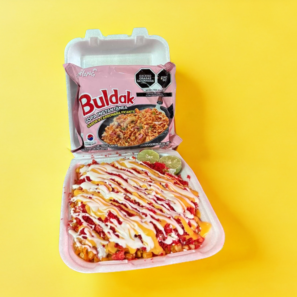 ramen buldak con elote y aderezos de la casa.