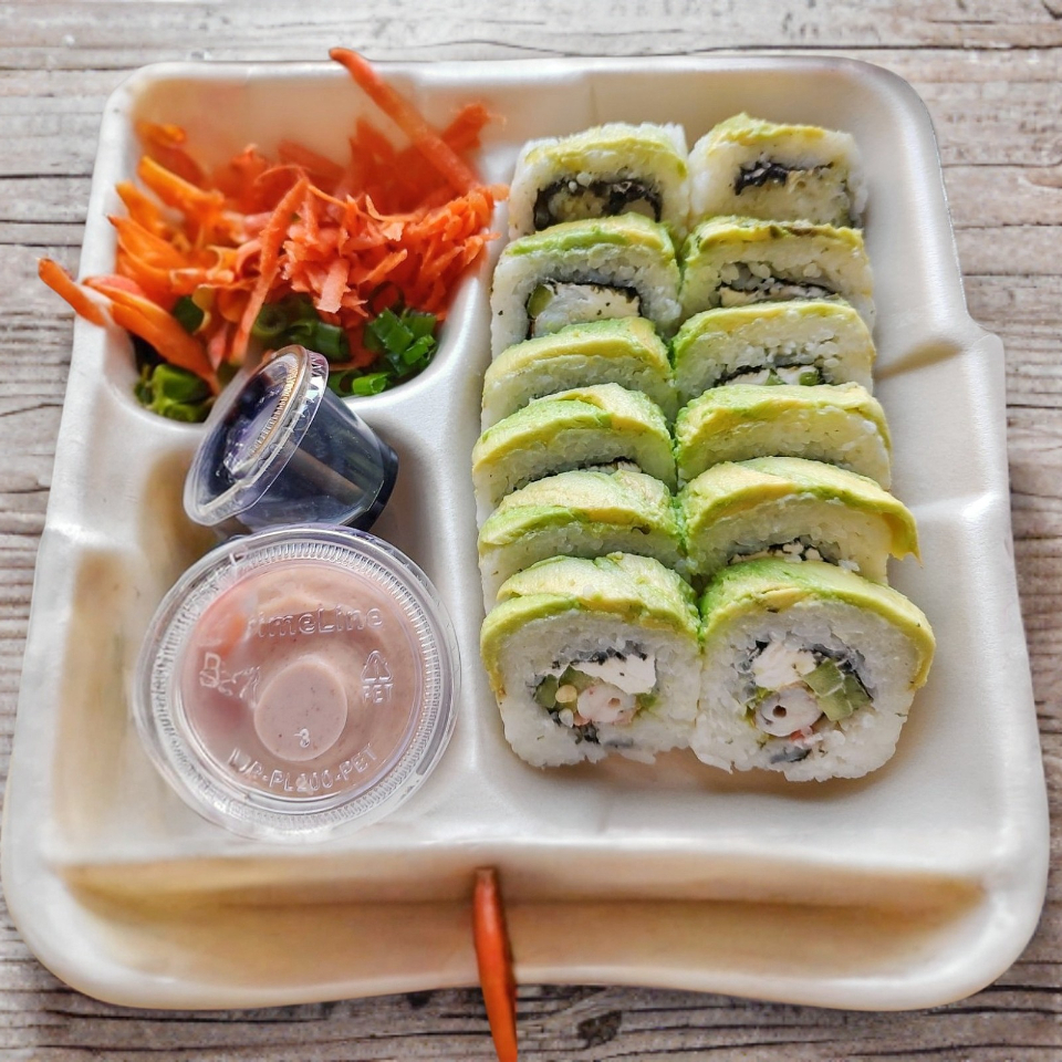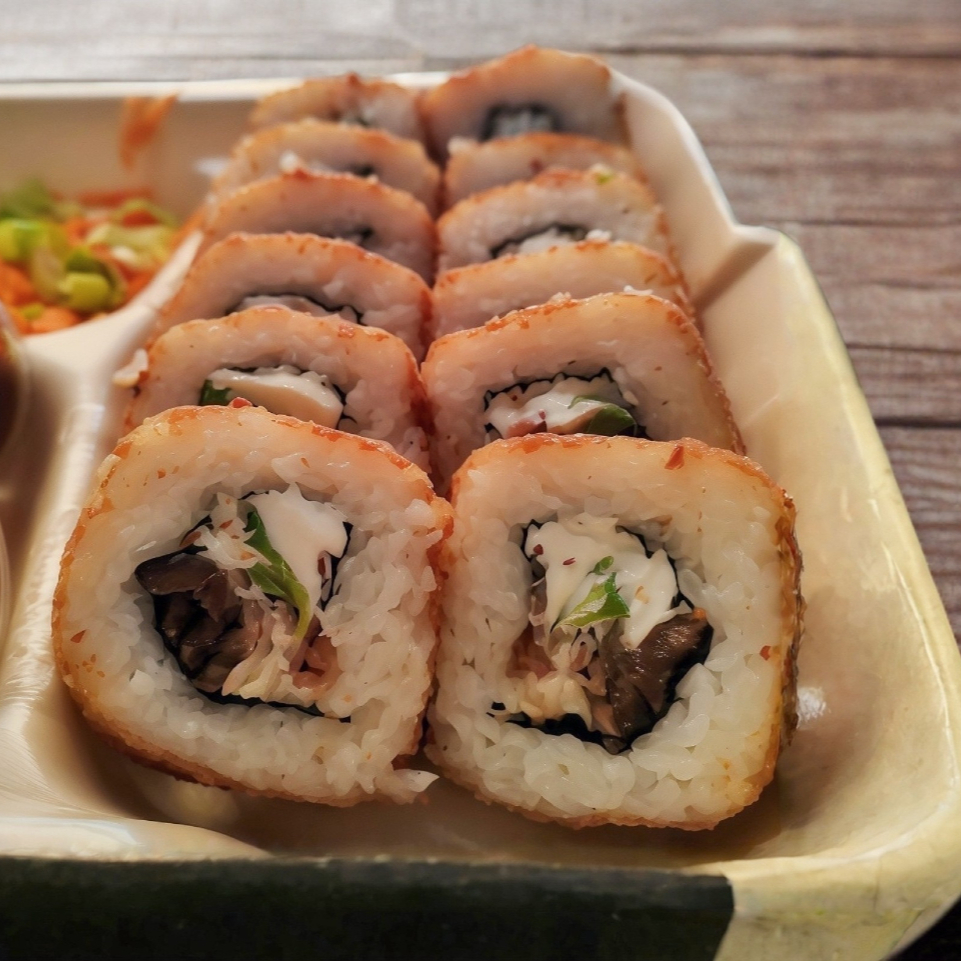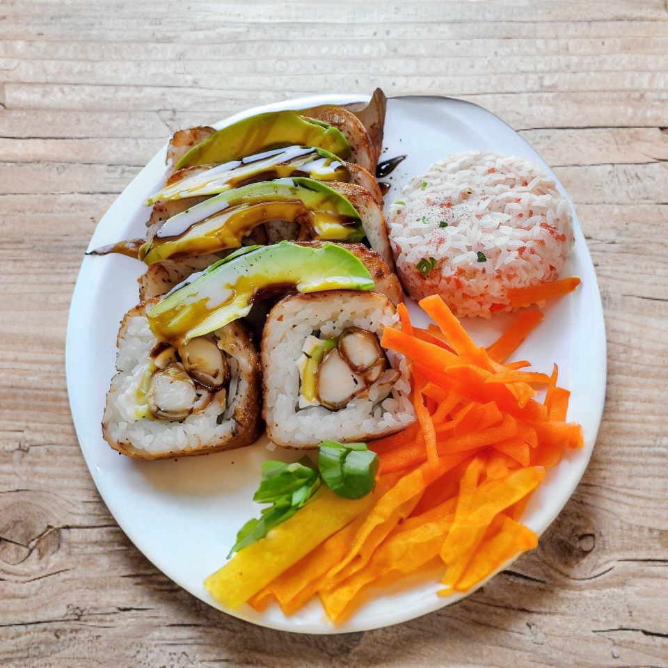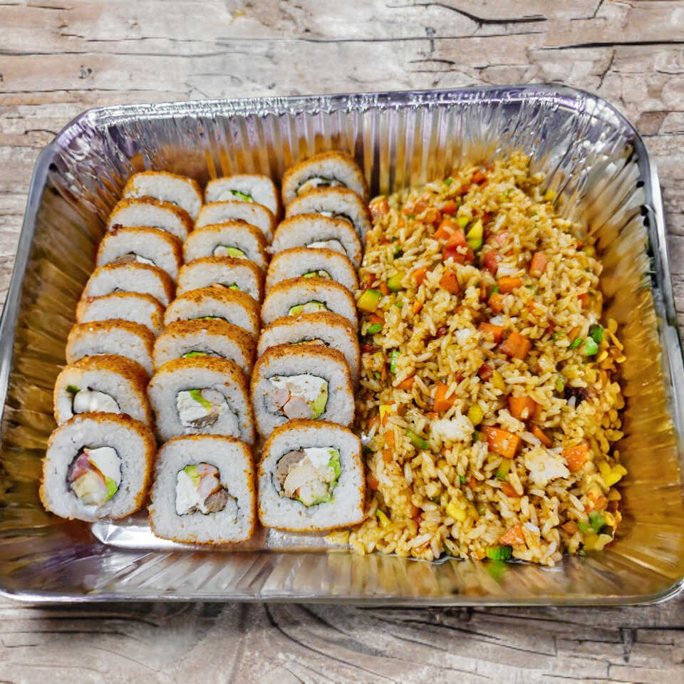 3 rollos*1 + Yakimeshi de Verduras (Zanahoria y calabaza)*2