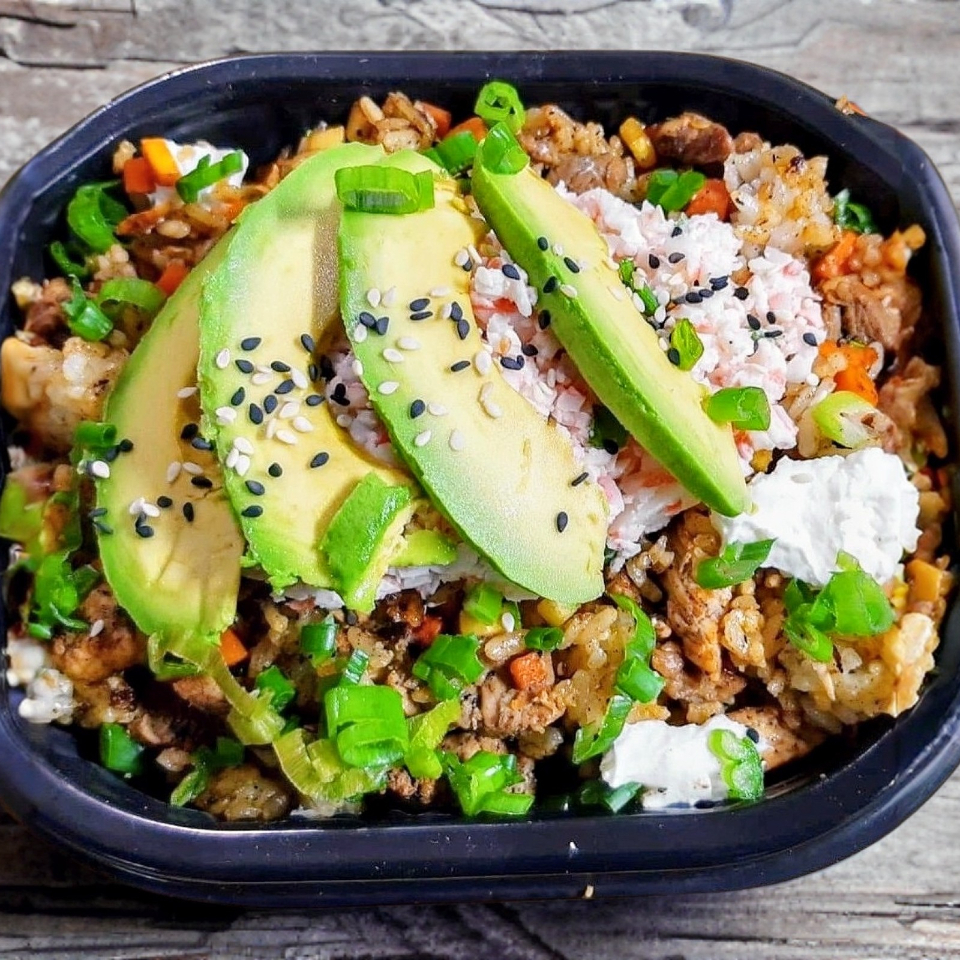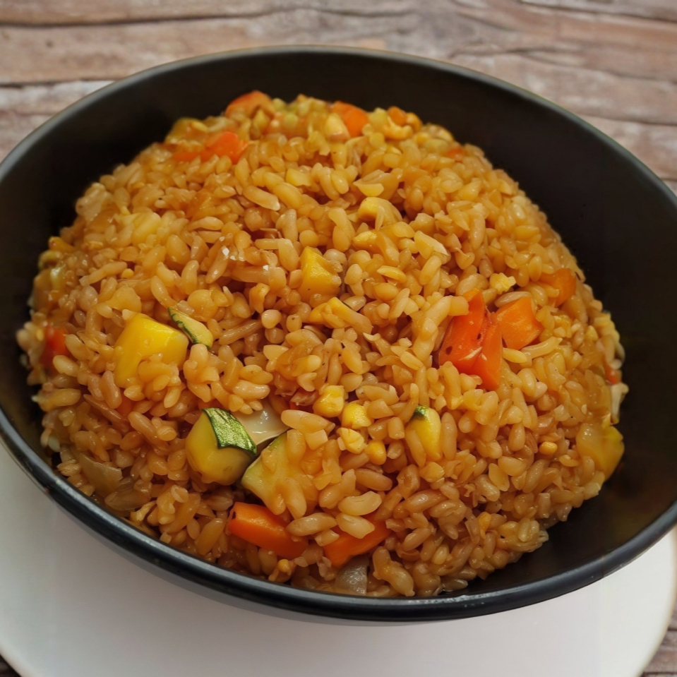Arroz frito, calabacita, zanahoria, res, pollo y tocino