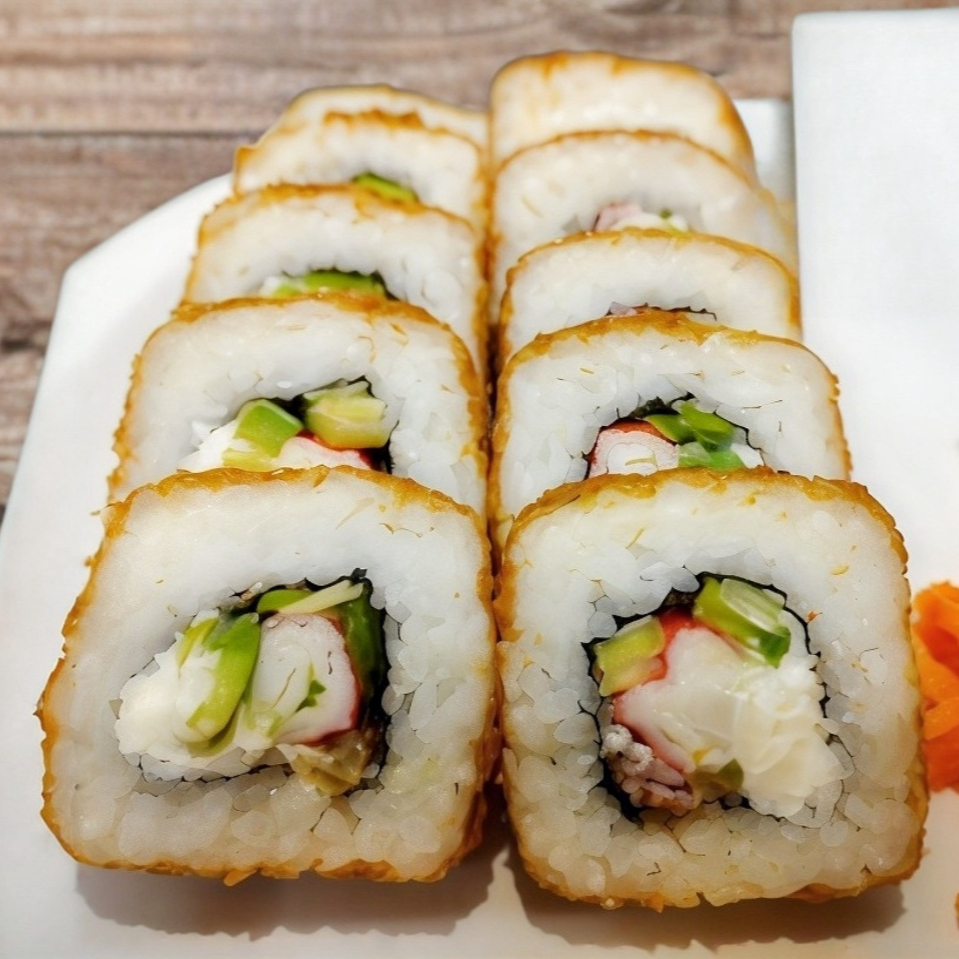 Alga, philadelphia, aguacate, surimi, chile güerito, tocino y cebollín.