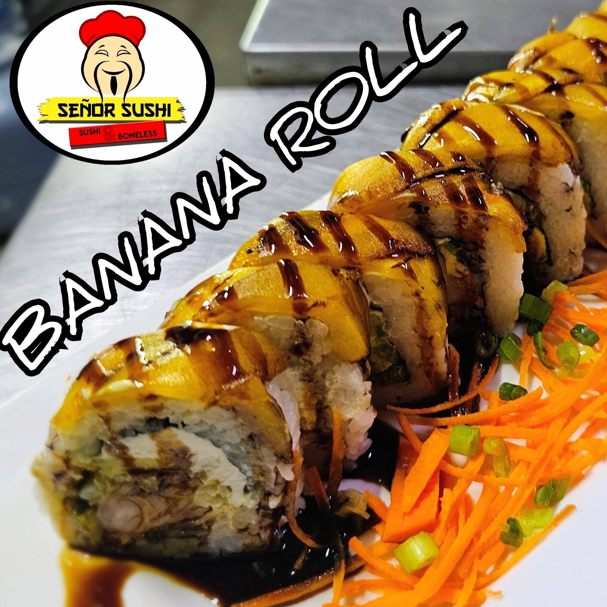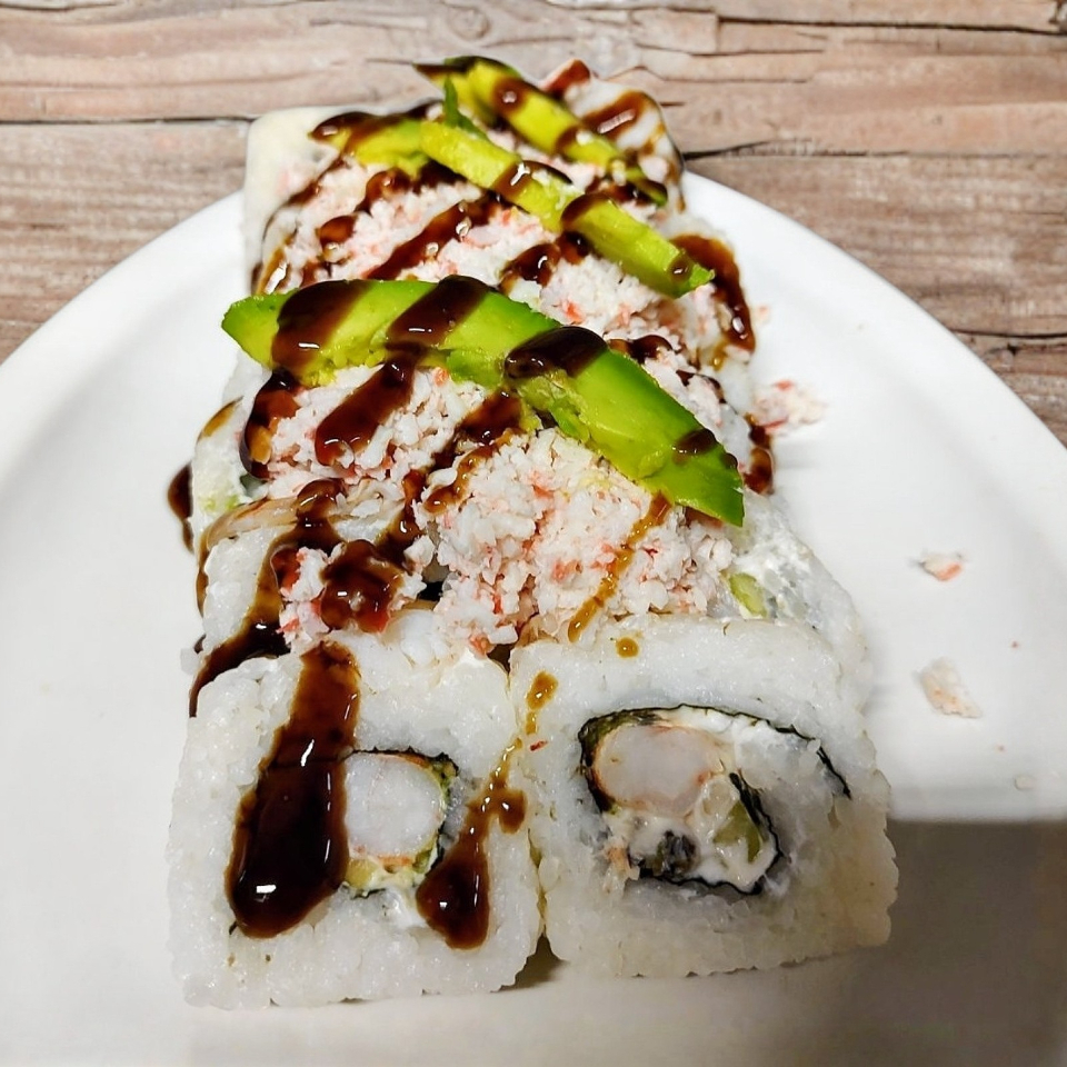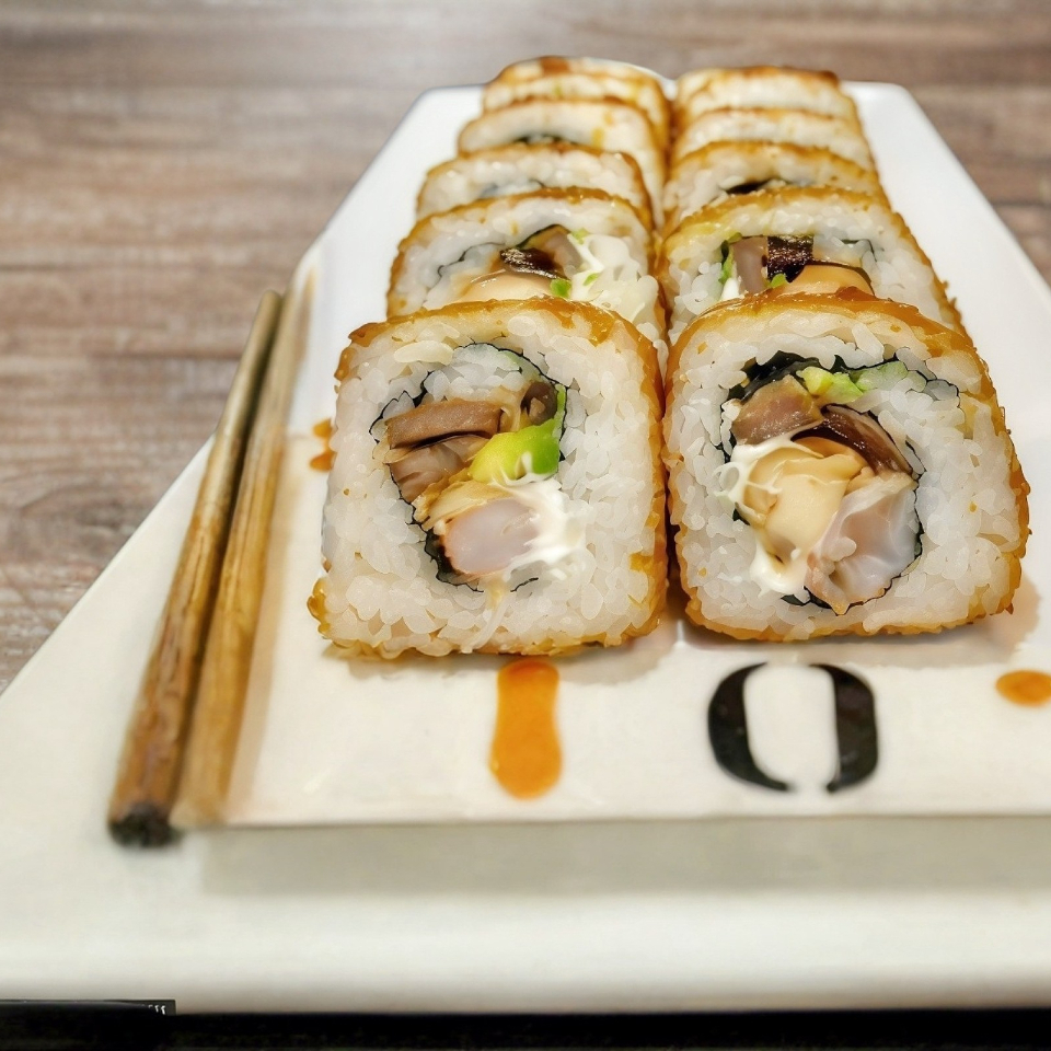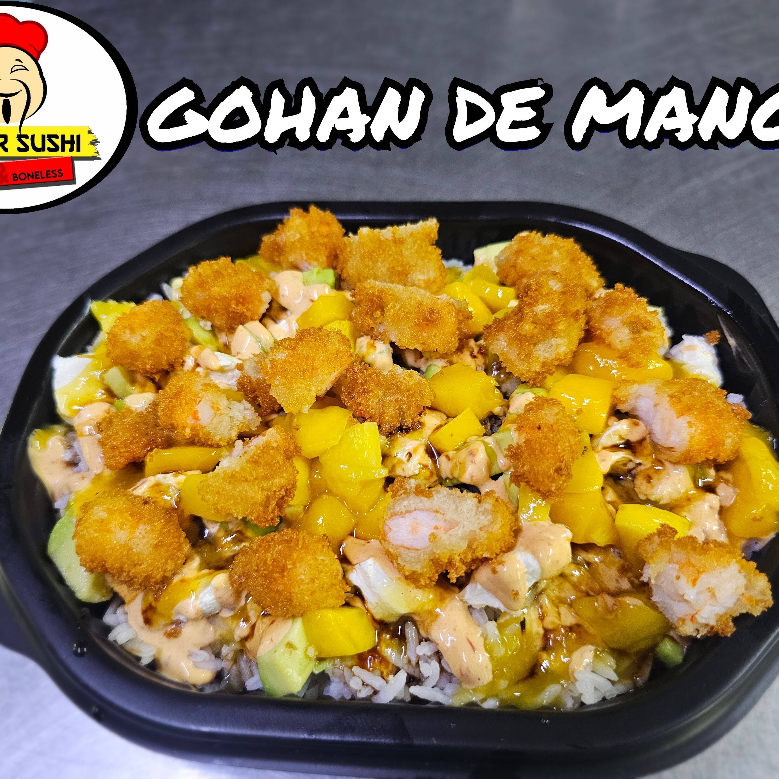 Cama de arroz blanco, camaron empanizado,pepino,Philadelphia, aguacate y mango bañados en salsas anguila,chipotle y mangohabanero