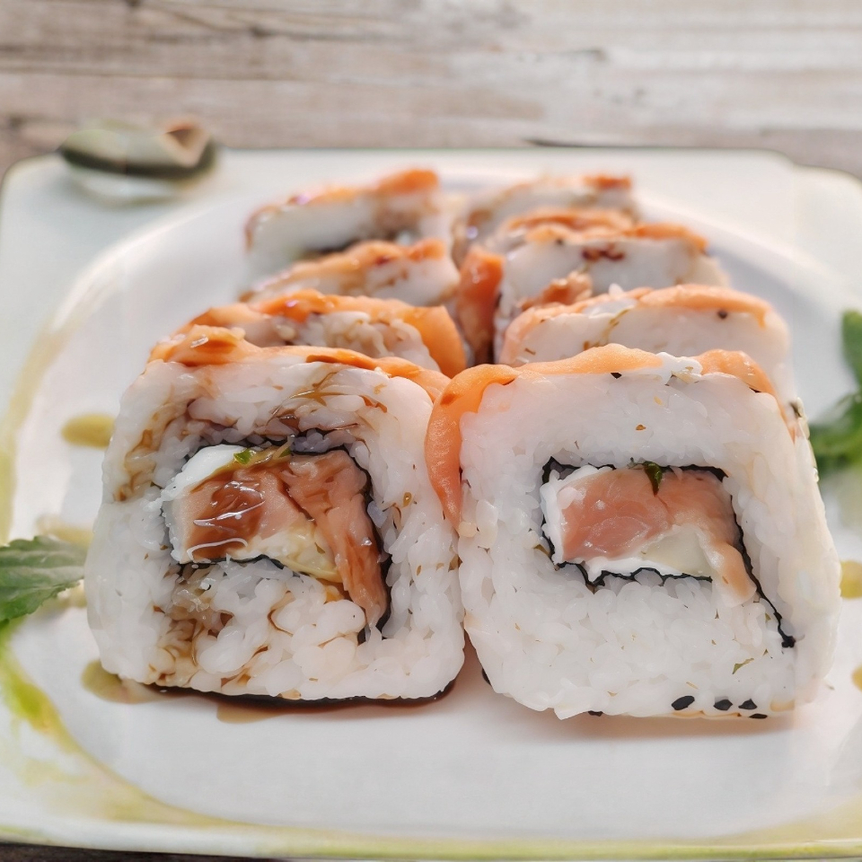 Alga, philadelphia, aguacate, pepino y salmón, por fuera forrado con salmón y salsa de anguila.
